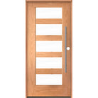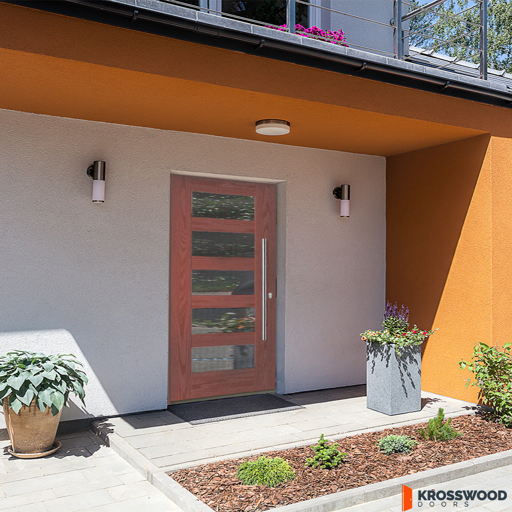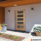 The ASCEND Modern Faux Pivot 5 Lite Window Fiberglass Front Door from Krosswood Doors is a unique statement piece that will bring your home to the forefront of contemporary design. This striking door features a stainable mahogany grain fiberglass texture looks like real wood and five clear glass windows to let in plenty of natural light. Unlike traditional pivot doors which require costly modifications to expand your entryway, Krosswood’s faux pivot doors are hung on standard hinges and function with a simple push-pull design which includes pull bar handles, a roller catch installed at the top, and single deadbolt borehole for security. Personalize your entryway by choosing from one of our vibrant stains, or order your wood-like door unfinished, ready to paint or stain in your color preference.