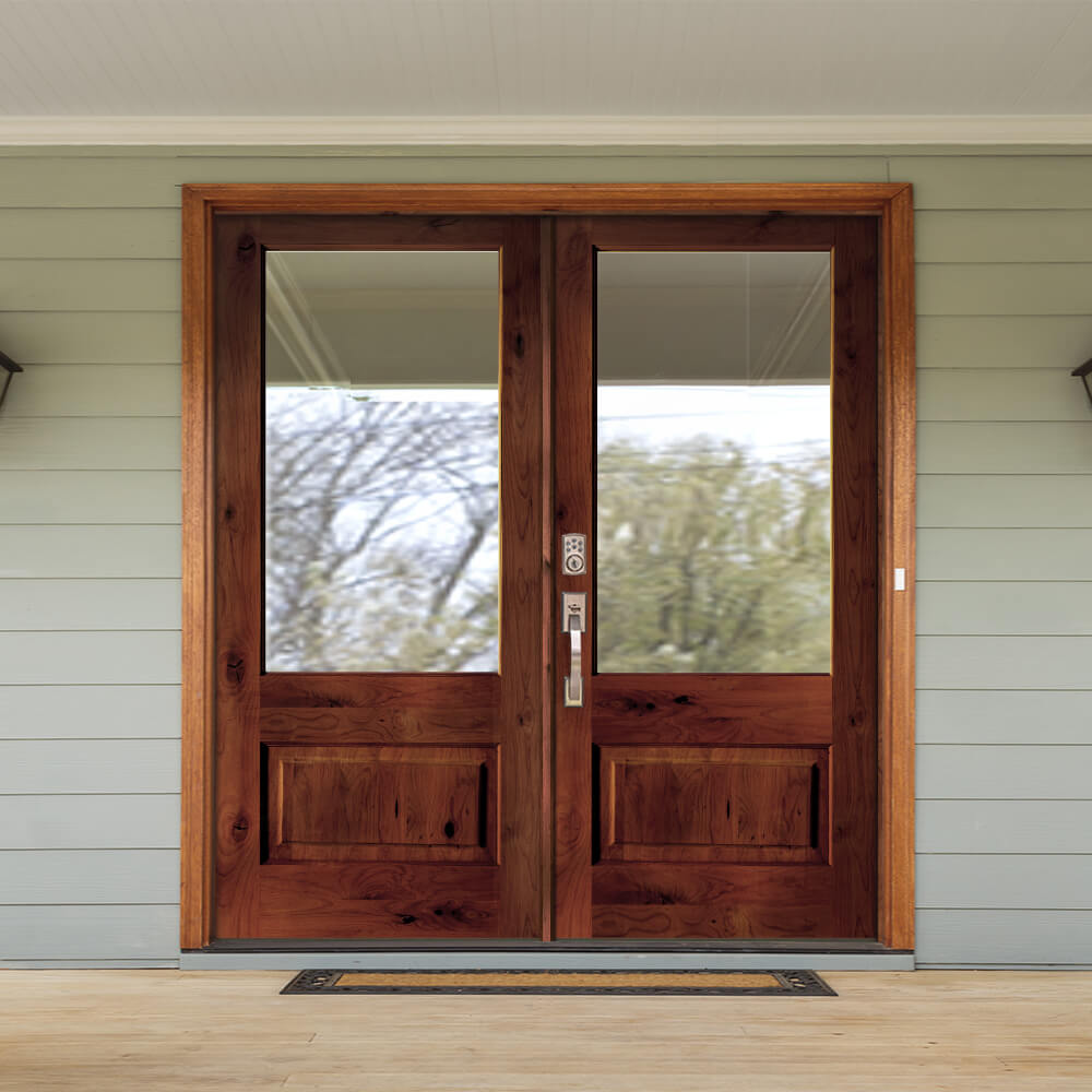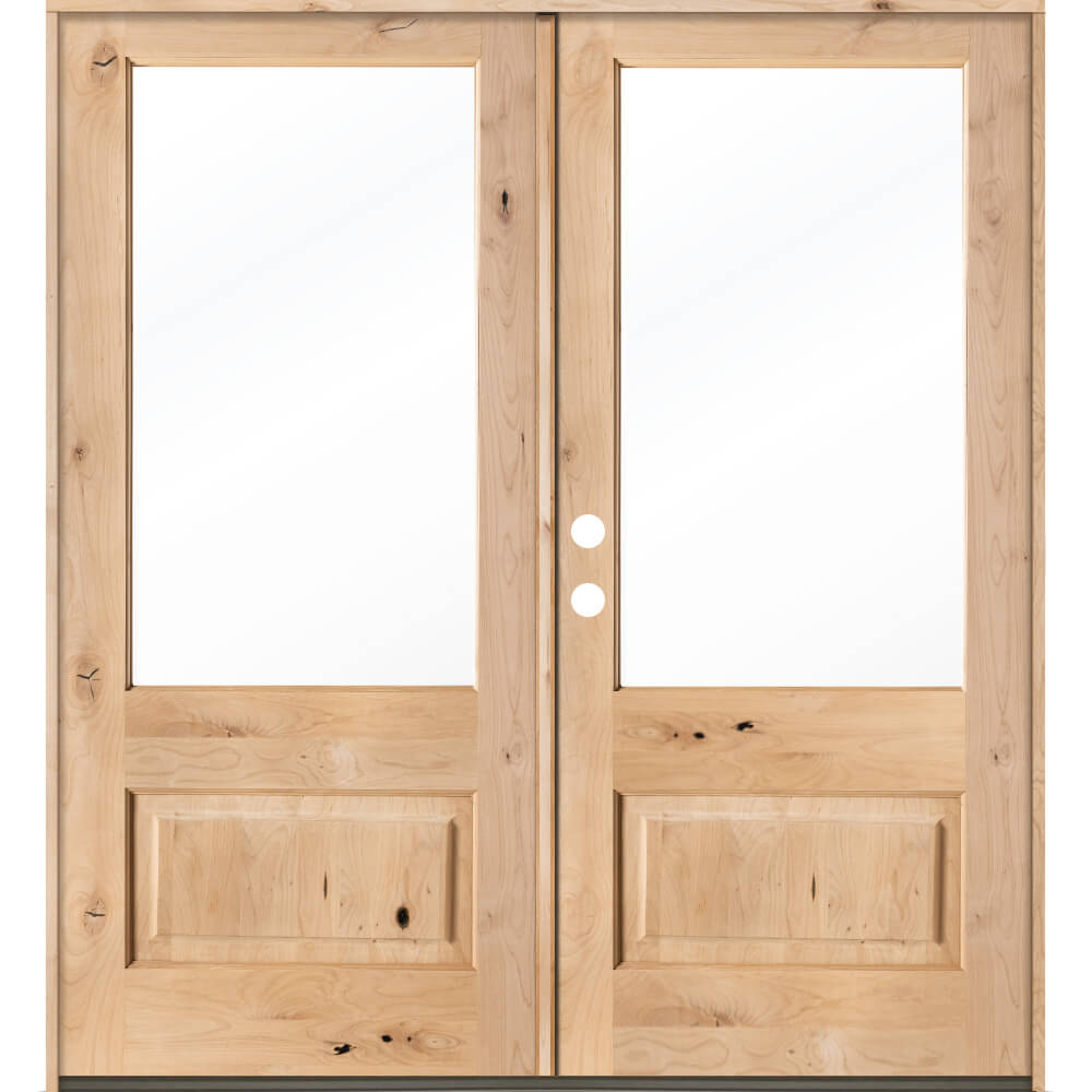 Add a personal touch to your entryway with the stunning Modern Farmhouse Knotty Alder 3/4 Lite Clear Glass Exterior Double Door from Krosswood Doors. This solid wood door is a contemporary take on Rustic design with natural wood grain, unique knotting, and two insulated clear glass window panels which allow natural sunlight to filter through. Find your perfect glass door today with our customizable size, layout, and stain options.