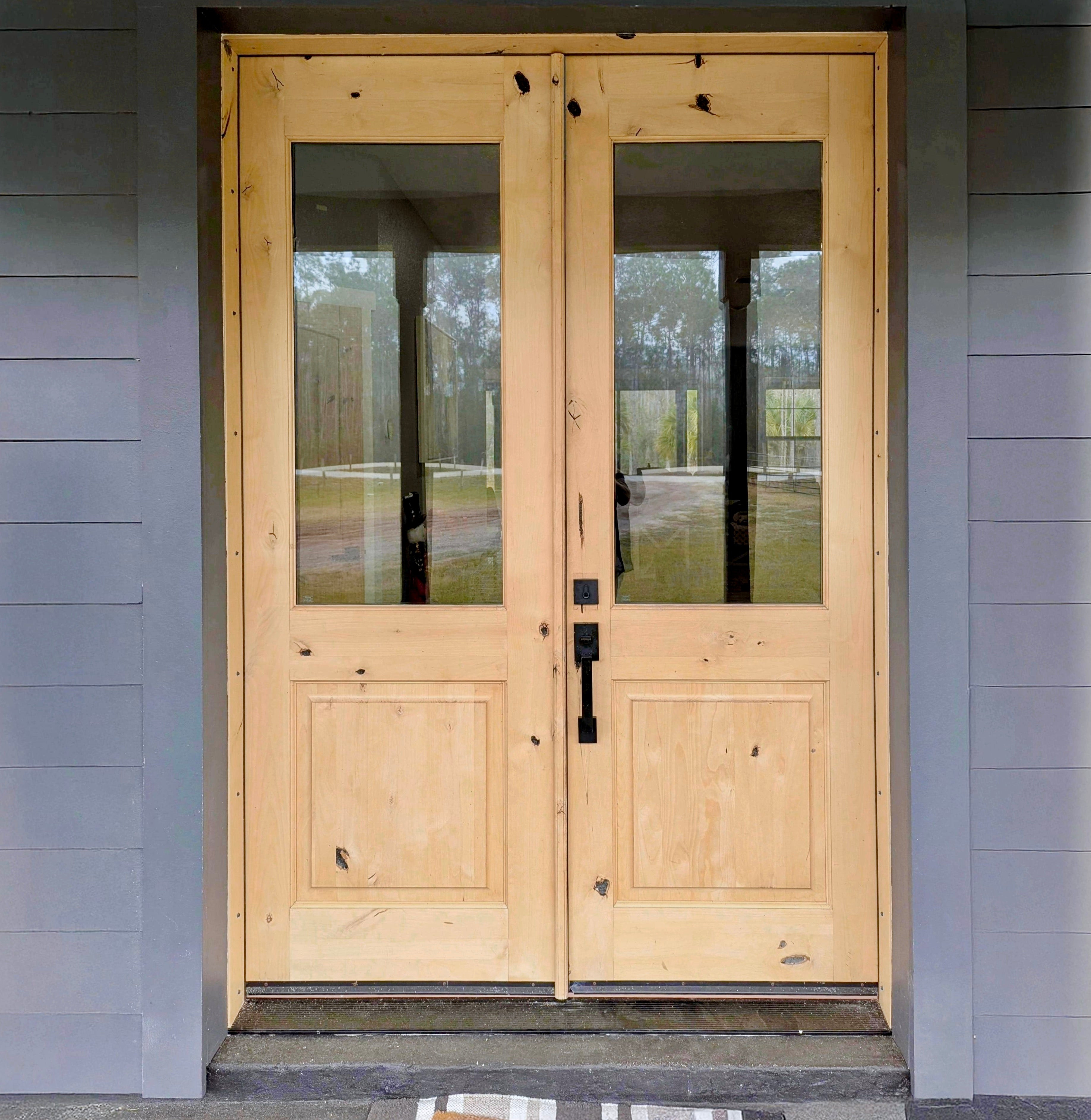Create a warm and inviting atmosphere full of natural light with the Modern Farmhouse Knotty Alder Half Lite Clear Glass Front Double Door from Krosswood Doors. This stunning solid wood door showcases superior craftsmanship and features natural wood grain, unique knotting, and large glass windows to allow sunlight into your entryway. Customize your perfect door today with our vibrant stain selection - expertly applied for your convenience in the United States - or order your door unfinished, ready to paint or stain in your color preference.