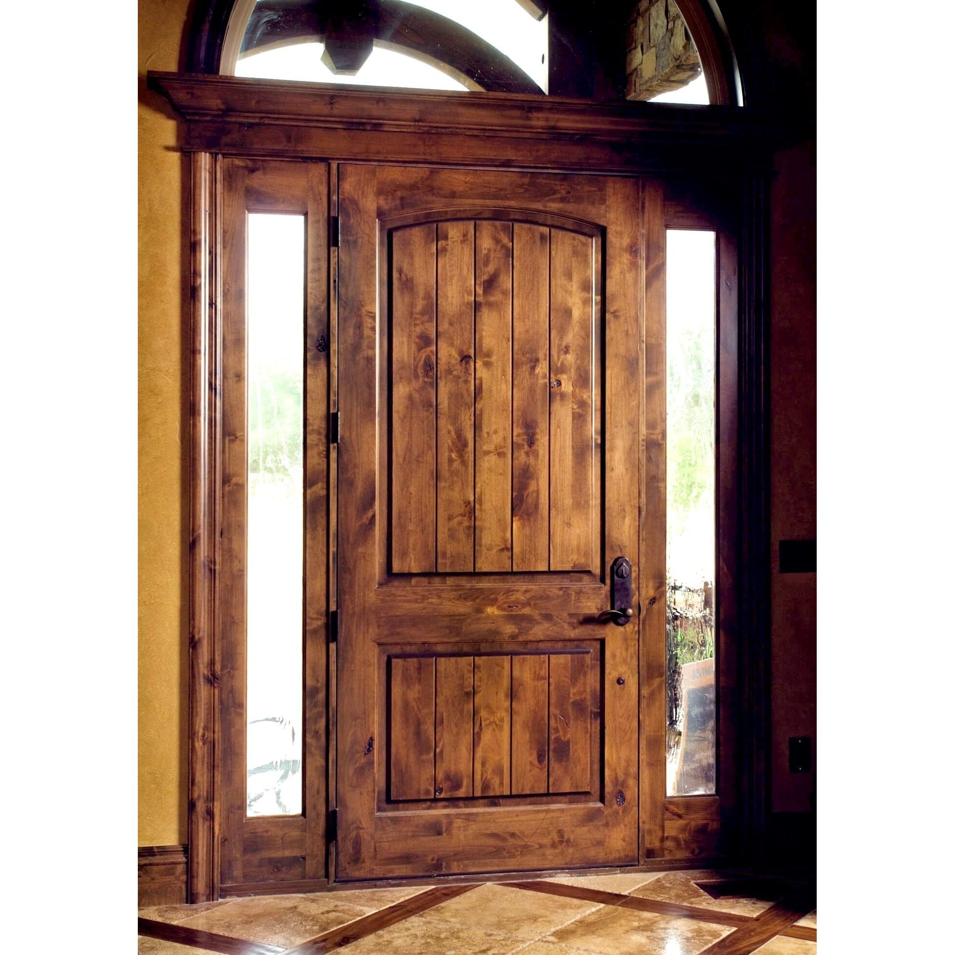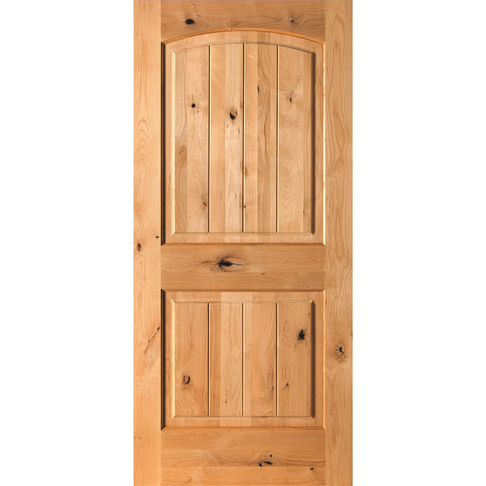 Nothing says, “Come on in!” like the Rustic Farmhouse Knotty Alder Arch Top V-Groove Exterior Door from Krosswood Doors. This modern take on a Rustic front door features natural wood grain, unique knotting, and two V-groove panels to bring a touch of personality to your entryway. Our doors are made with superior doweled construction and hand-finished in the United States to ensure the highest quality. Customize your perfect fit today with our wide selection of size, layout, and stain options.