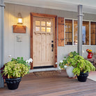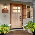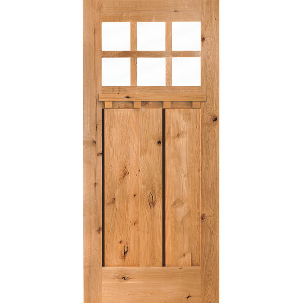 A high value home deserves a high value entryway, and the American Craftsman Knotty Alder 6 Lite Clear Glass Window Front Door from Krosswood Doors embraces handcrafted design and superior quality construction. Every solid wood door is engineered for strength and longevity, and features natural wood grain, unique knotting, a decorative dentil shelf, and six clear beveled glass panels to allow natural light into your home. Find your perfect fit today with our customizable size, layout, and stain options.