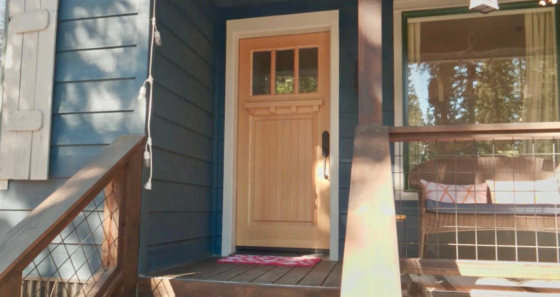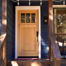 The Craftsman 3 Lite Glass Window V-Groove Hemlock Wood Front Door with Dentil Shelf by Krosswood Doors features stunning, rot-resistant Hemlock wood which is perfect for painting or staining, and features three insulated glass windows, wood dentil shelf accent, and a hand-crafted V-groove panel. Create your perfect door today with our customizable stain, size, and layout options.