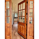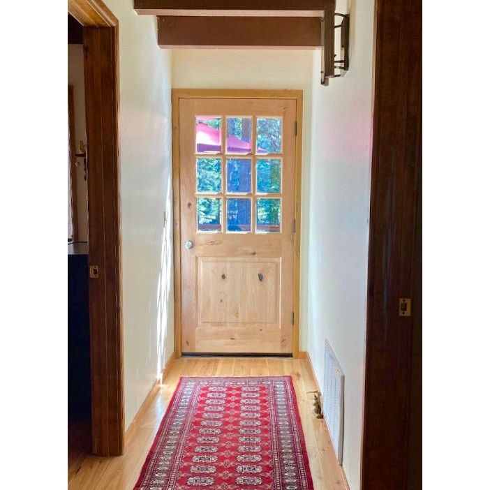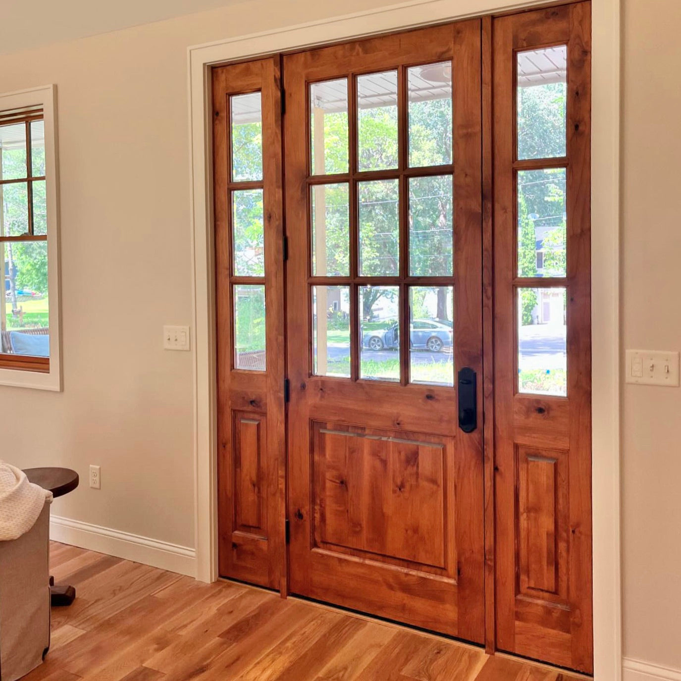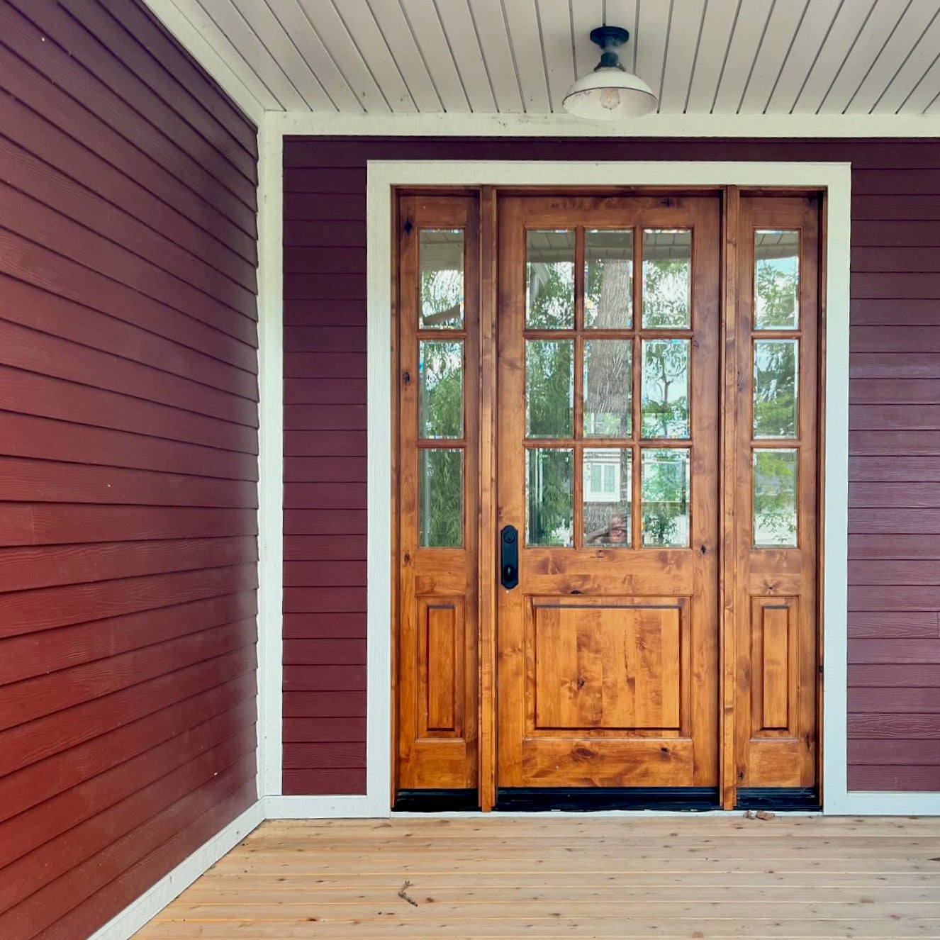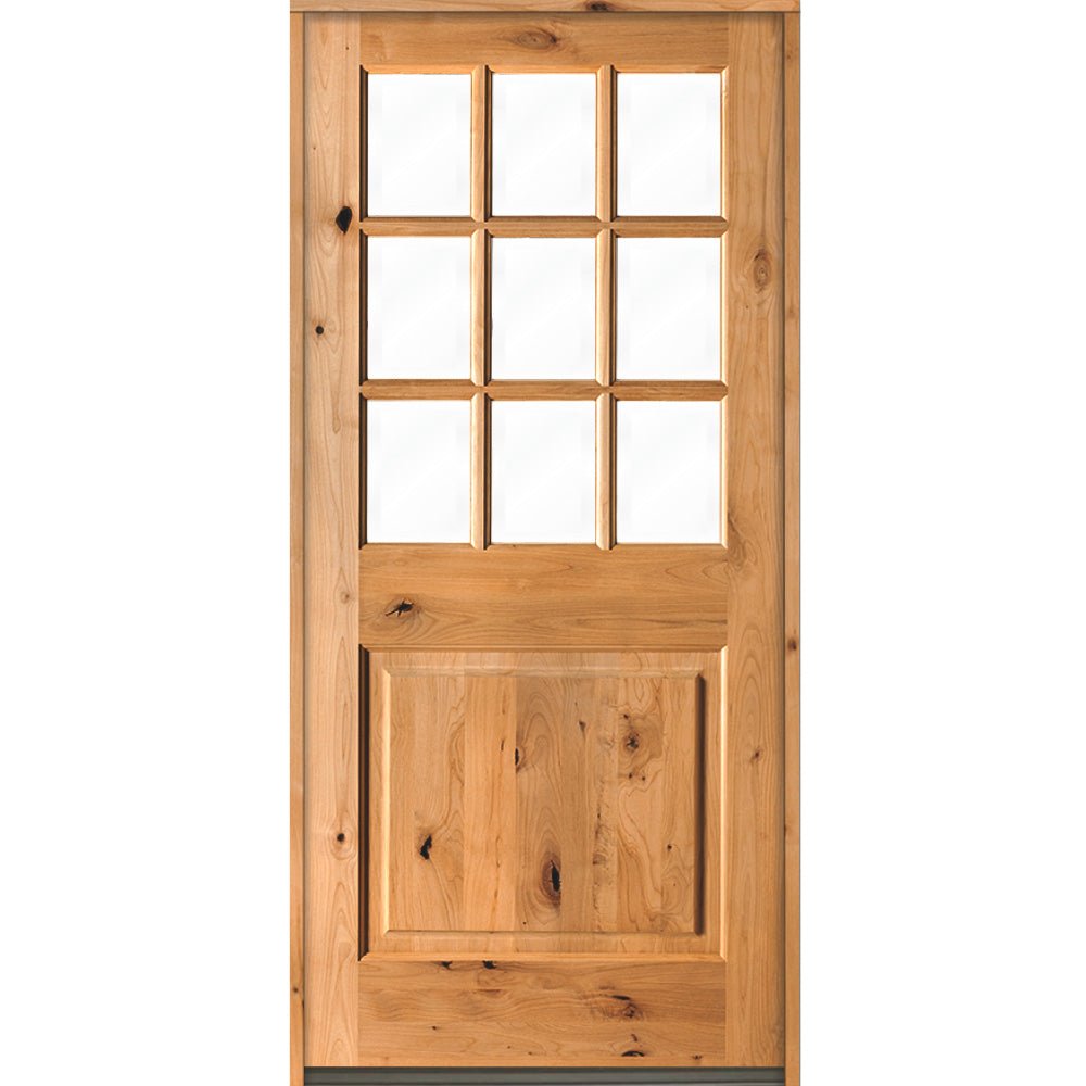The Modern Farmhouse Knotty Alder 9 Lite Clear Glass Front Door from Krosswood Doors is the perfect rustic inspiration for your Farmhouse cottage or Craftsman bungalow. Superior quality, natural wood grain, unique knots, and nine beveled glass panels come together to create an eye-catching piece for your home that will stand the test of time. Find your perfect fit today with our customizable sizes, layouts, and stain options.