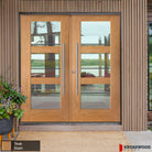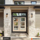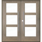 Bring your home to the forefront of contemporary design with the BRIGHTON Modern 3 Lite Lite Glass Faux Pivot Wood-Like Fiberglass Front Double Door from Krosswood Doors. Unlike traditional pivot doors that may require costly modifications to your entryway, our faux-pivot doors arrive prehung and equipped with front and back pull bar handles, a roller catch at the top, and a single deadlock borehole for easy installation on standard hinges. This eye-catching entry door features six tempered low-e clear glass windows and a mahogany fiberglass texture that looks like real wood while being rot and weather resistant. Personalize your entryway by choosing from our vibrant stain selection, applied in the United States, or order your double door unfinished, ready to paint or stain in your color preference.