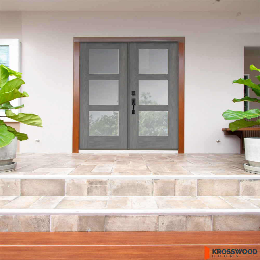 Presenting our contemporary masterpiece: the BRIGHTON Modern Fiberglass 3 Lite Frosted Glass Front Double Door from Krosswood Doors, with a mahogany wood textured surface that feels like real wood without the maintenance. Designed to complement a variety of architectural styles, this modern fiberglass exterior door stands as a testament to both design and function with six satin glass privacy windows, insulating core, and mahogany wood like textured finish, ready to be painted or stained in a variety of colors. Find the perfect double door for you with our versatile stain options – expertly applied in the United States – as well as glass, layout, and sidelight options.