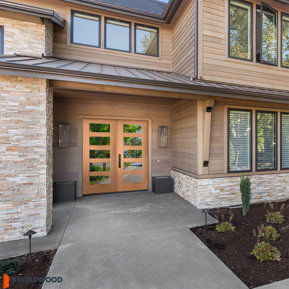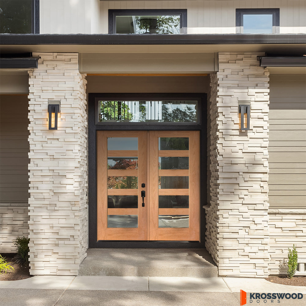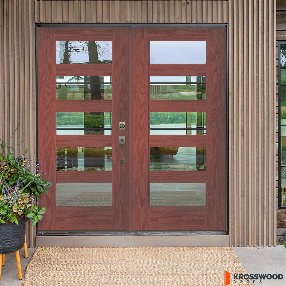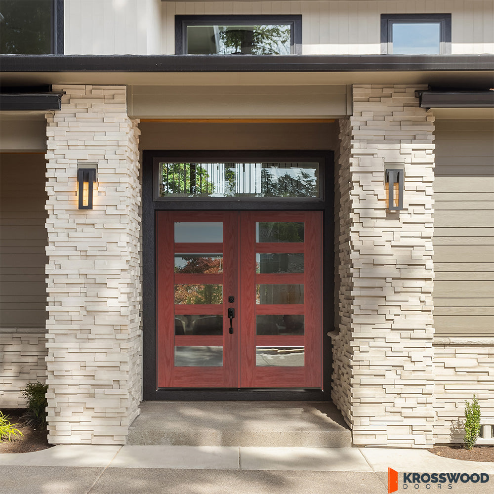 With the ASCEND Modern Fiberglass 5 Lite Clear Glass Wood-Like Front Double Door from Krosswood Doors, you're not just investing in a door – you’re investing in a statement piece that offers the long-lasting security your family deserves. Designed to complement a variety of architectural styles, this contemporary fiberglass exterior door features a mahogany wood textured surface that feels like real wood without the maintenance. Ten clear glass windows, composite fiberglass surface, and a high-density insulating foam interior ensure your door is at the forefront of contemporary design. Find the perfect exterior door for you with our versatile stain options – expertly applied in the United States – as well as glass, layout, and sidelight options.