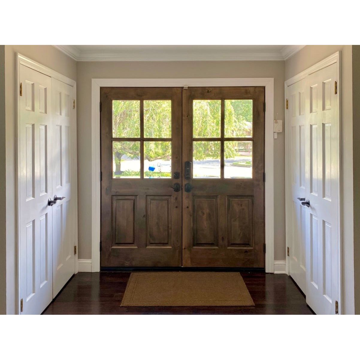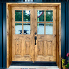 The Modern Farmhouse Knotty Alder 4 Lite Clear Glass Exterior Double Door from Krosswood Doors brings a touch of nature into your home with its natural wood grain, unique knotting, and four glass panels that allow sunlight to filter through. Our glass doors are crafted with superior construction and hand finished in the United States to ensure that each one is a true work of art. Find your perfect fit today with our customizable layouts, sizes, and stain options.