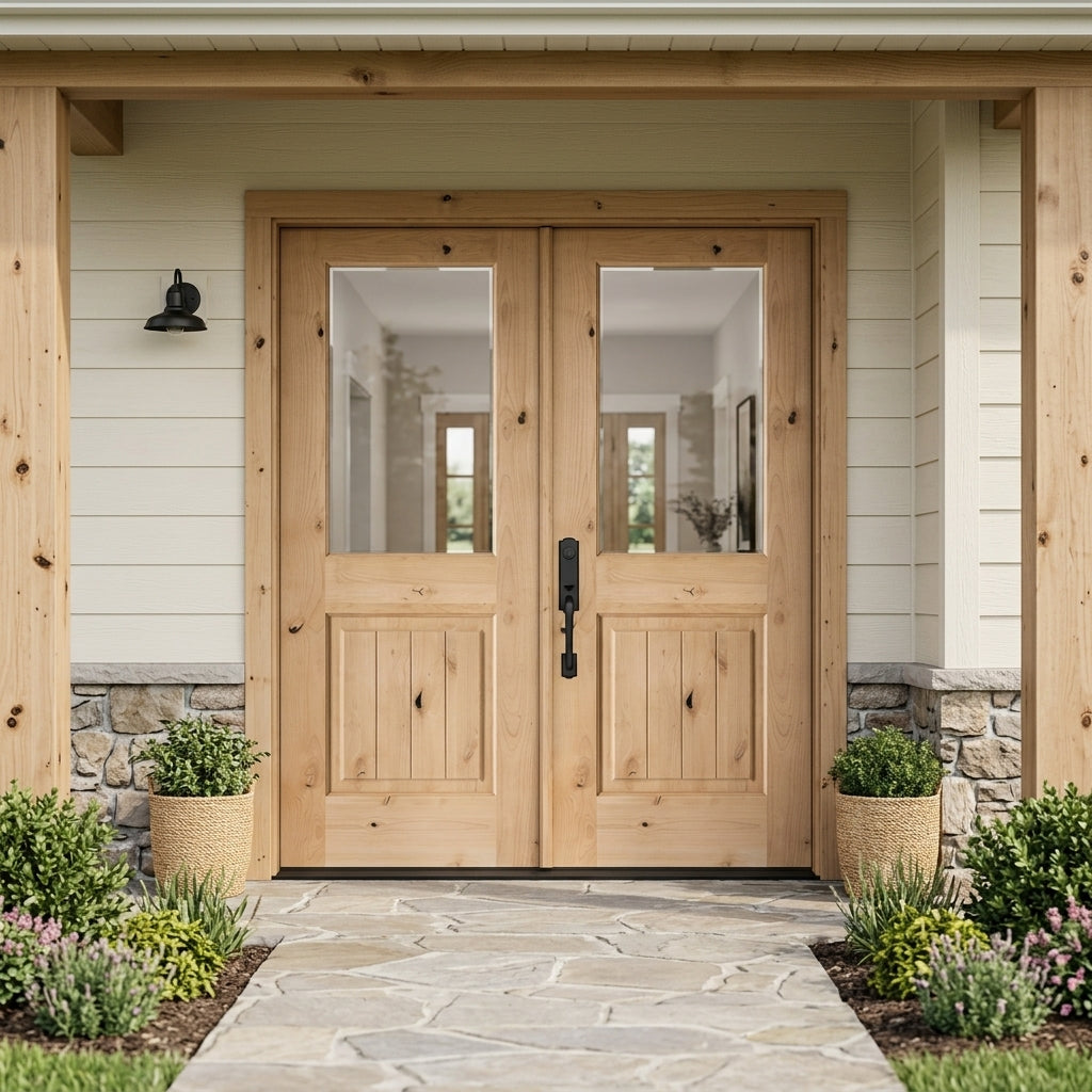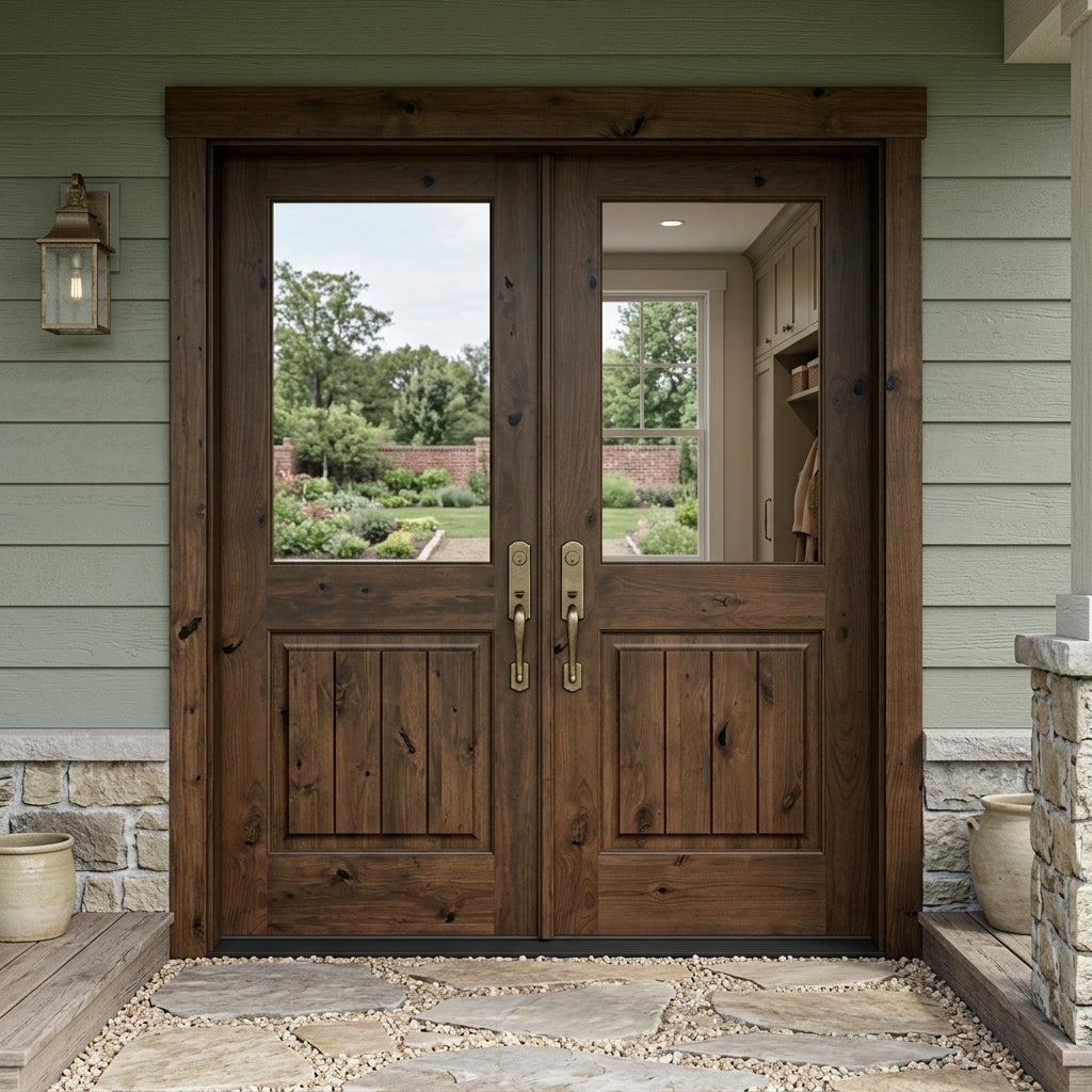 Rustic Half Glass V-Groove Knotty Alder Front Double Door
