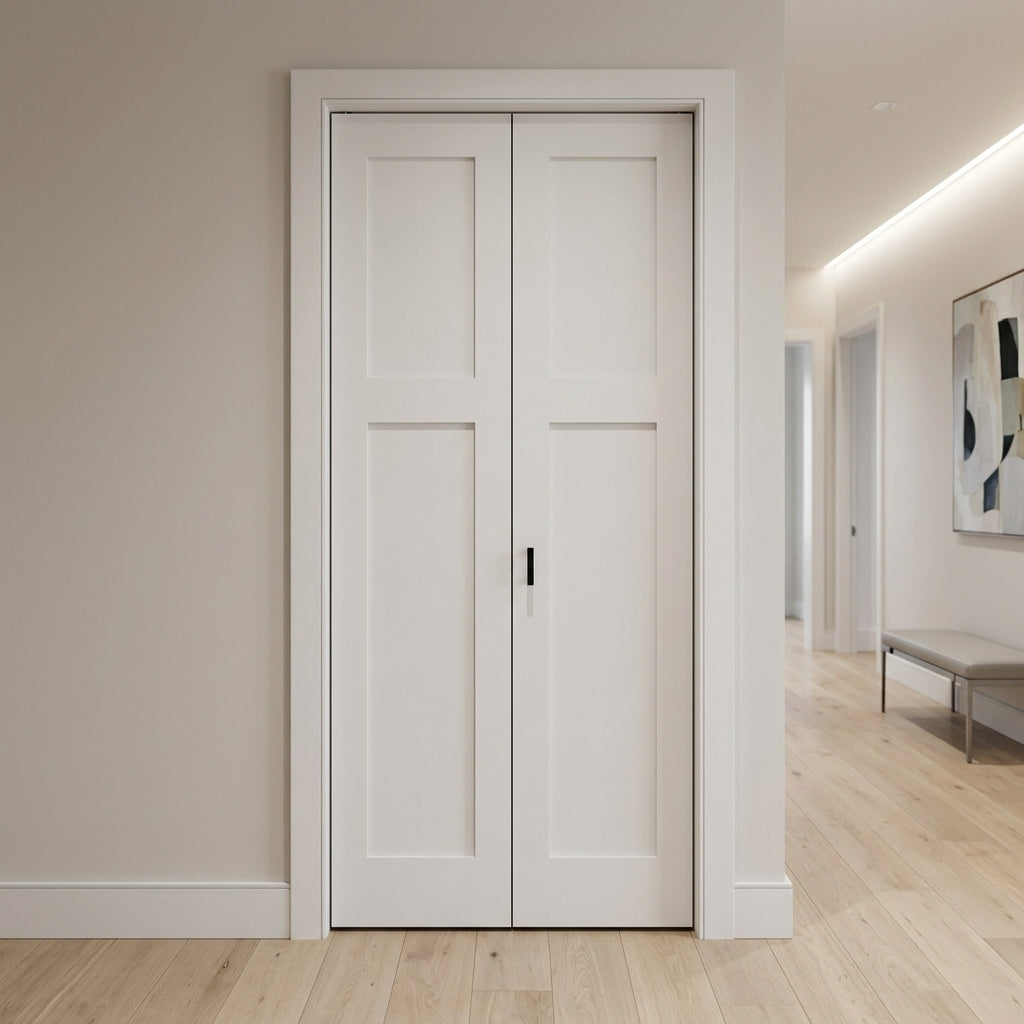 The Craftsman 2 Panel Primed MDF Bi-Fold Interior Closet Shaker Door from Krosswood Doors is crafted with an understated design that stands the test of time. This classic folding Craftsman door features two primed panels with a solid core, providing superior insulation for any closet, bedroom, pantry, laundry room, or office. Arrives primed and ready to paint to match your interior décor, and ready-to-install with track hardware included.