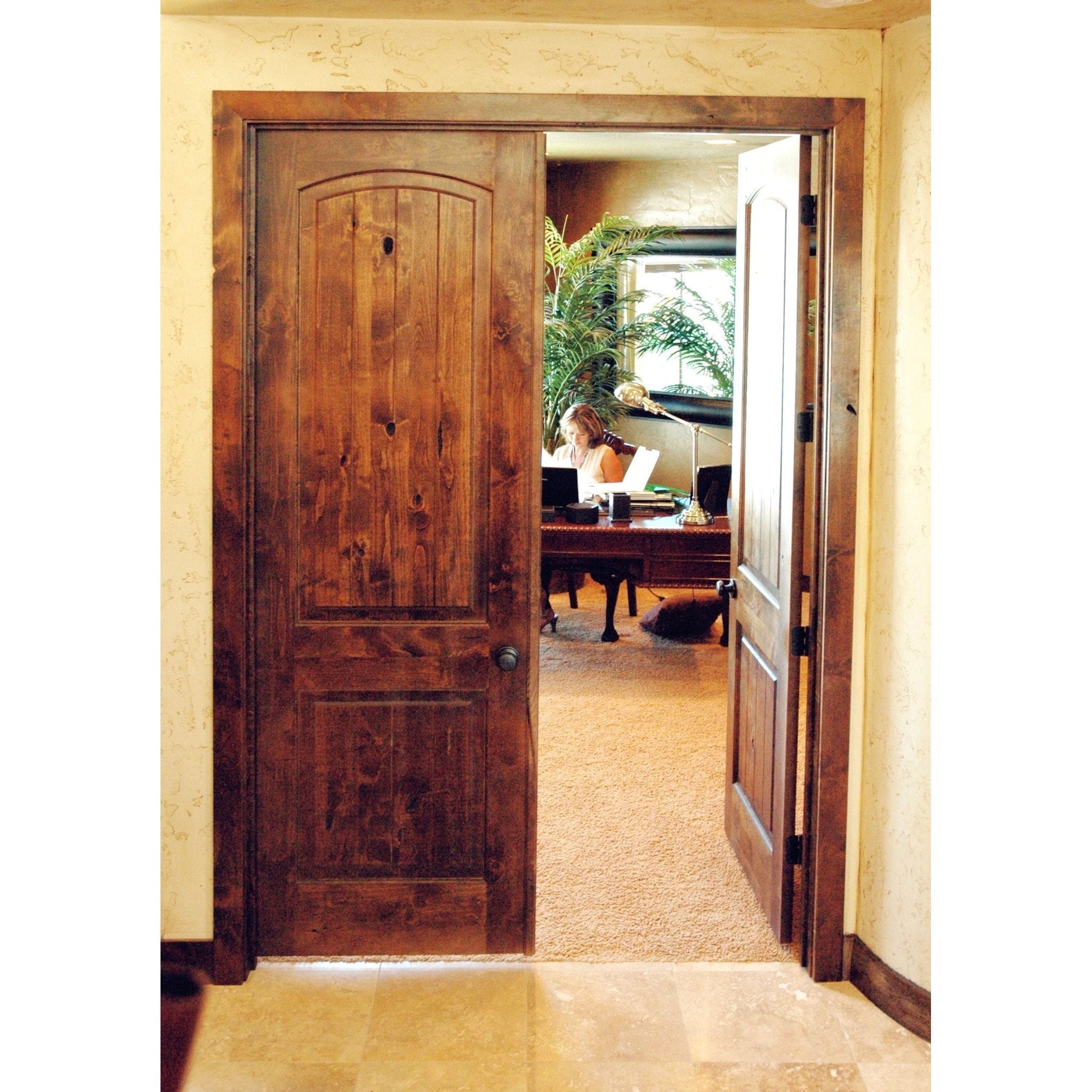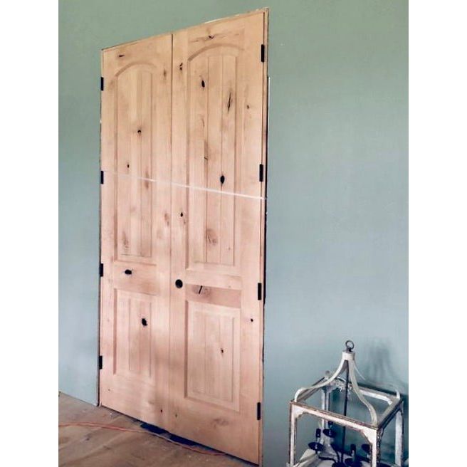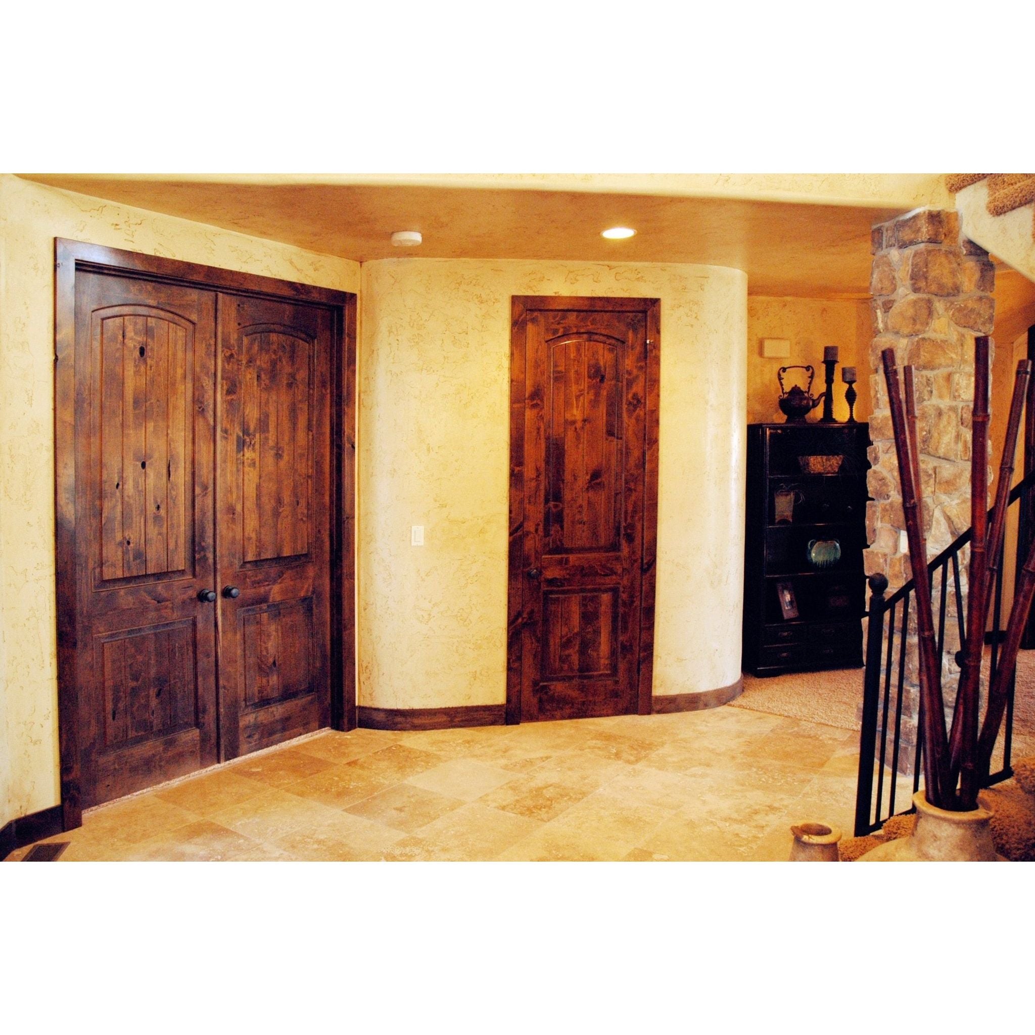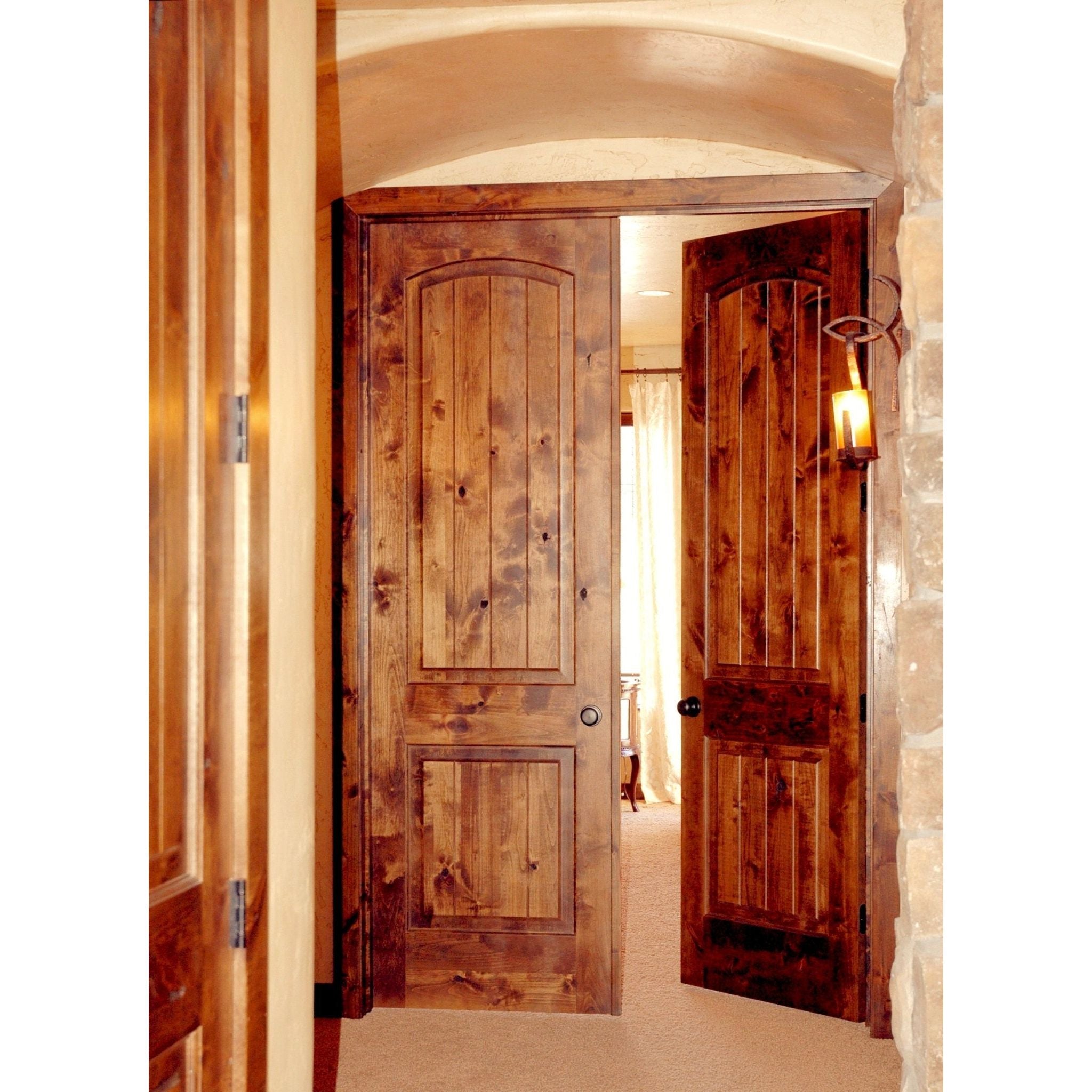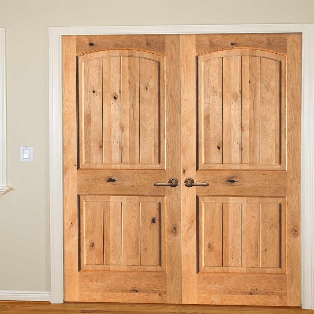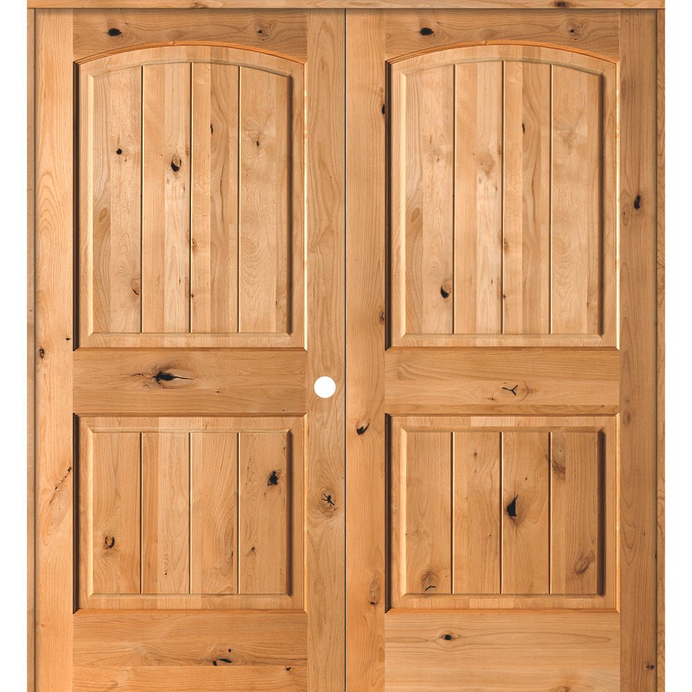Nothing says character like the exposed wood grain and unique, textured knotting of the Rustic Farmhouse Knotty Alder Arch Top V-Groove Wood Interior Double Door from Krosswood Doors. This charming Modern Farmhouse inspired door features superior craftsmanship, doweled construction, and hand finished V-groove panels to bring out the personality in any room. Find your perfect fit today with our custom size, layout, and stain options.