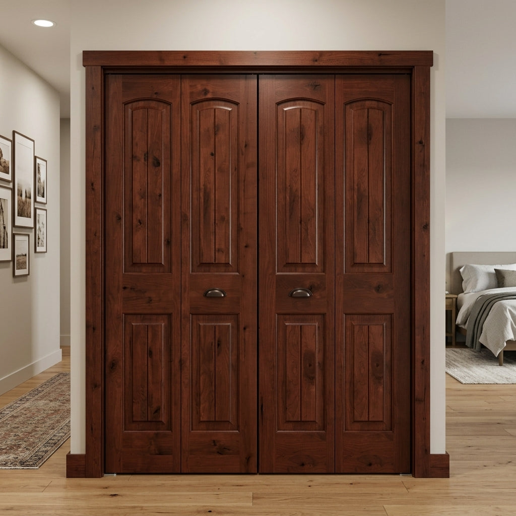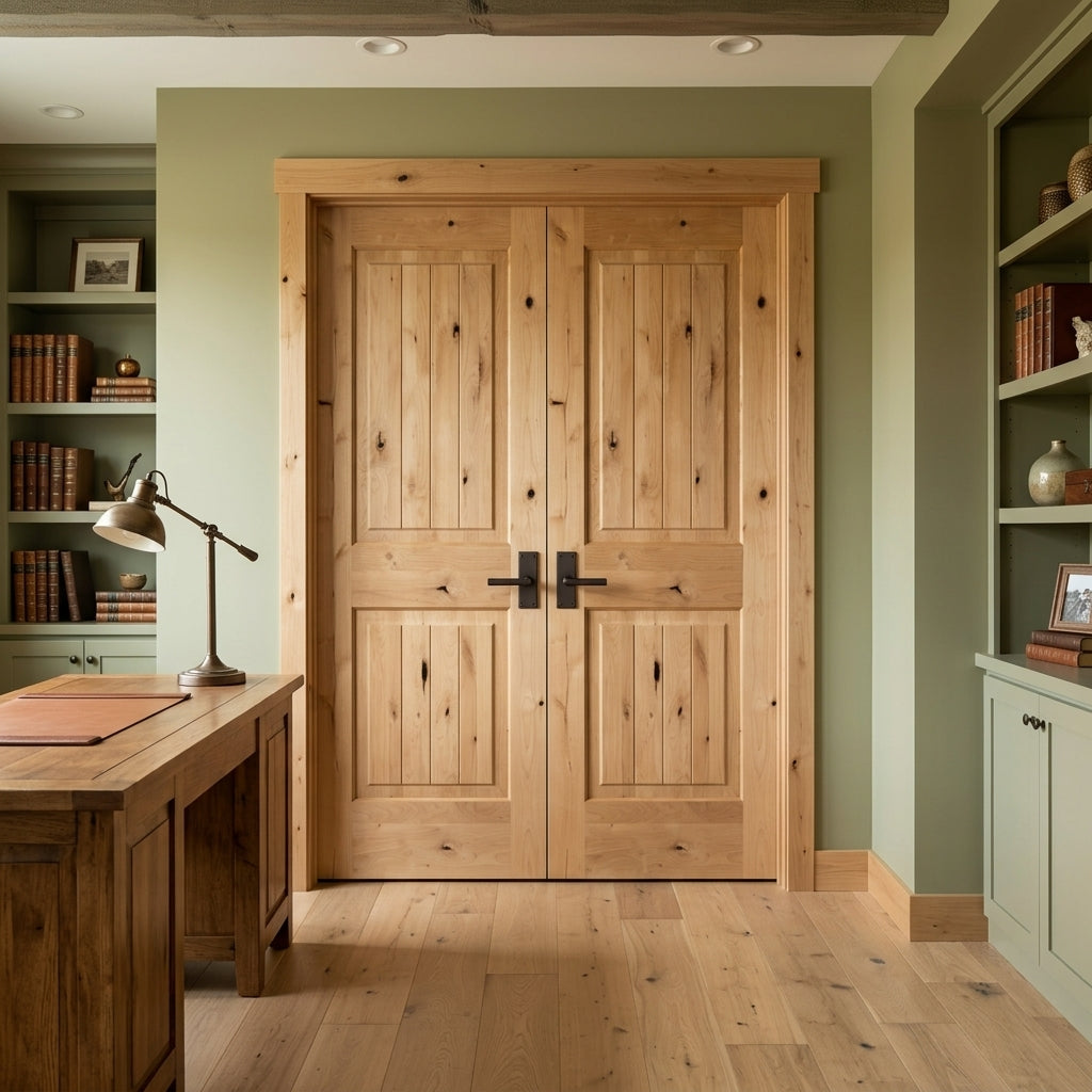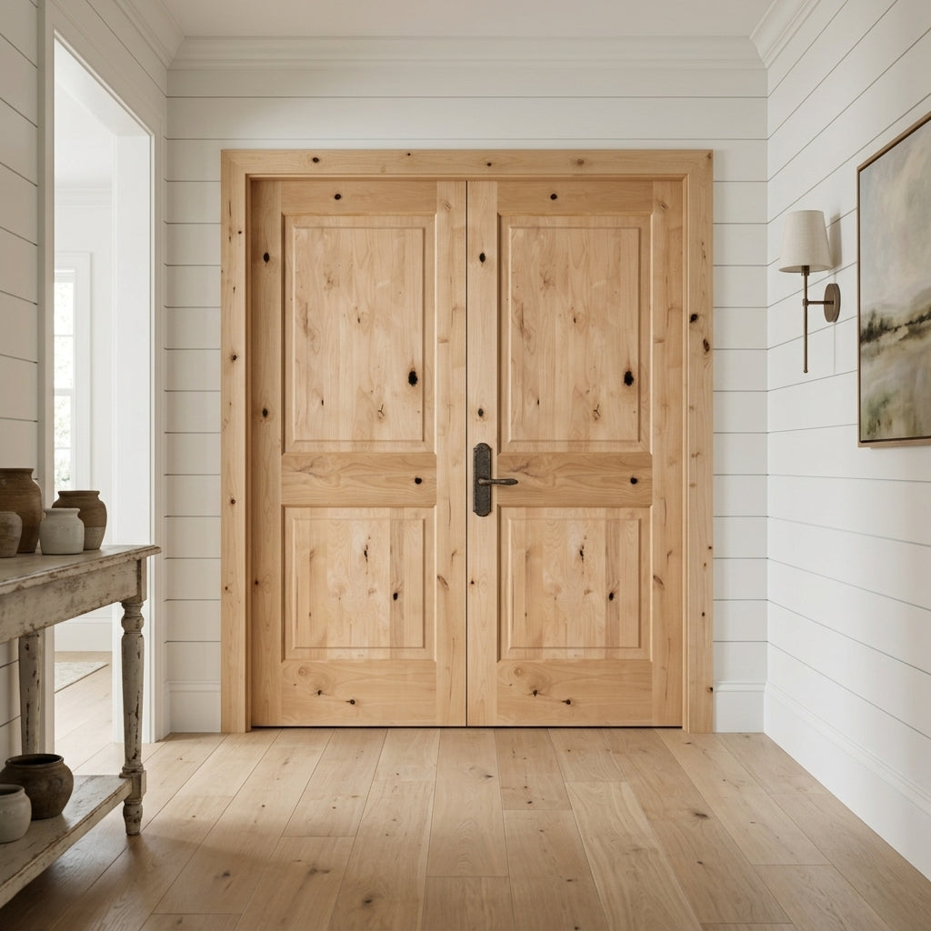 Nothing says character like the exposed wood grain and unique, textured knotting of a Knotty Alder Wood Interior Double Door from Krosswood Doors. Our Modern Farmhouse inspired doors feature superior craftsmanship and doweled construction to bring out the personality in any room. Find your perfect fit today with our custom size, layout, and stain options.