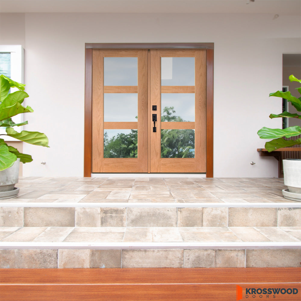 Présentation de notre chef-d'œuvre contemporain : la porte double avant en verre transparent à 3 carreaux BRIGHTON Modern en fibre de verre de Krosswood Doors, avec une surface texturée en bois d'acajou qui ressemble à du vrai bois sans entretien. Conçue pour compléter une variété de styles architecturaux, cette porte extérieure moderne en fibre de verre témoigne à la fois du design et de la fonctionnalité avec six fenêtres en verre transparent, un noyau isolant et une finition texturée semblable à du bois d'acajou, prête à être peinte ou teintée dans une variété de couleurs. . Trouvez la porte double parfaite pour vous grâce à nos options de teinture polyvalentes – appliquées de manière experte aux États-Unis – ainsi qu'aux options de verre, d'agencement et de lumière latérale.