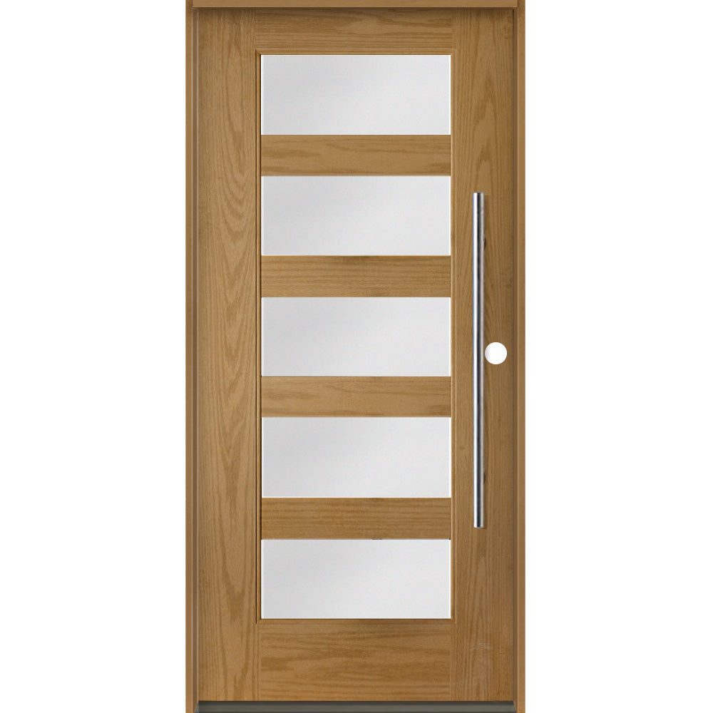 La vie moderne n'a pas besoin d'être compliquée – simplifiez votre vie et votre maison avec la porte d'entrée pré-suspendue en fibre de verre et verre satiné ASCEND Modern Faux Pivot 5 Lite de Krosswood Doors. Cette porte contemporaine présente une texture en fibre de verre d'acajou durable qui ressemble à du vrai bois et cinq fenêtres en verre d'intimité gravées au satin pour laisser entrer la lumière naturelle tout en préservant l'intimité. Les fausses portes pivotantes de Krosswood sont suspendues à des charnières standard et fonctionnent avec une conception simple push-pull qui comprend des poignées à barre de traction, un loquet à rouleau installé en haut et un trou de pêne dormant unique pour plus de sécurité ; cela élimine le besoin d’agrandissement de l’entrée, long et coûteux, comme le nécessitent les portes pivotantes traditionnelles. Personnalisez votre porte d'entrée en choisissant parmi l'une de nos teintures – appliquées de manière experte aux États-Unis pour votre commodité – ou commandez votre porte brute, prête à peindre ou à teindre selon votre préférence de couleur.