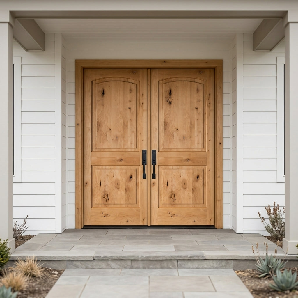 Porte double extérieure rustique en aulne noueux avec dessus en arc