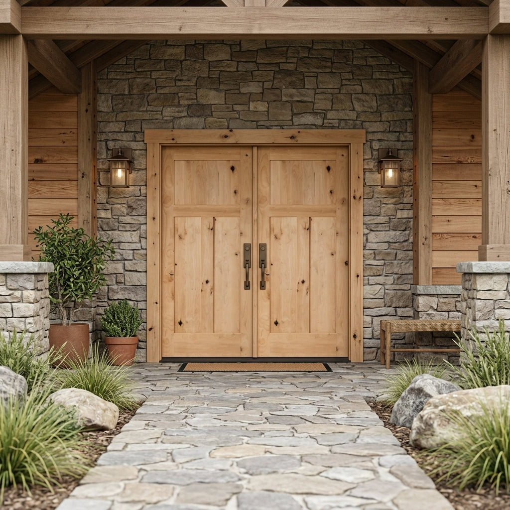 Porte double extérieure à 3 panneaux en aulne noueux Craftsman