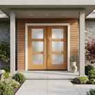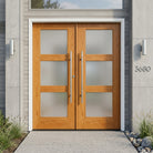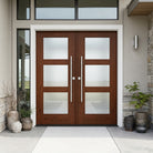 The BRIGHTON Modern Faux Pivot Frosted Glass Window Wood-Like Fiberglass Front Double Door from Krosswood Doors allows plenty of natural light into your entryway while maintaining privacy. Unlike traditional pivot doors that may require costly modifications to your entryway, our faux-pivot doors arrive prehung and equipped with front and back pull bar handles, a roller catch at the top, and a single deadlock borehole for easy installation on standard hinges. This eye-catching double door features six satin etched low-e privacy glass windows and a mahogany fiberglass texture that looks like real wood while being rot and weather resistant. Personalize your entryway by choosing from our vibrant stain selection, expertly applied in the United States, or order unfinished, ready to paint or stain in a variety of colors.