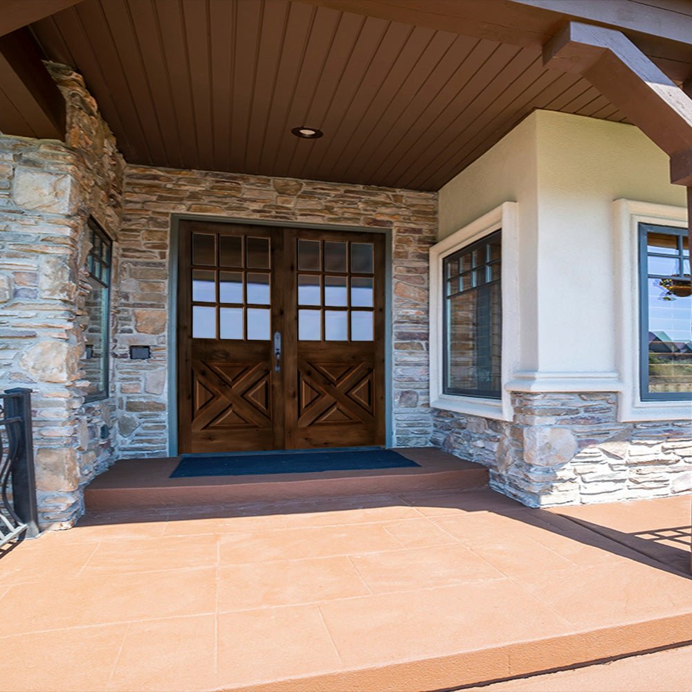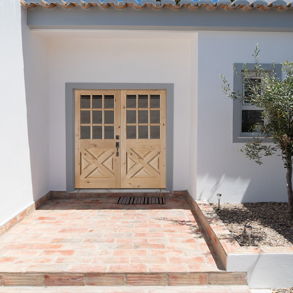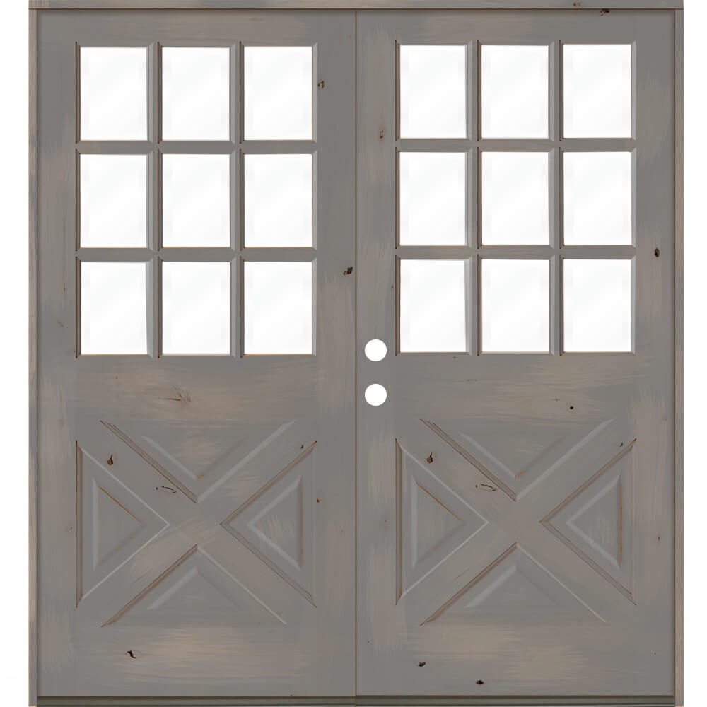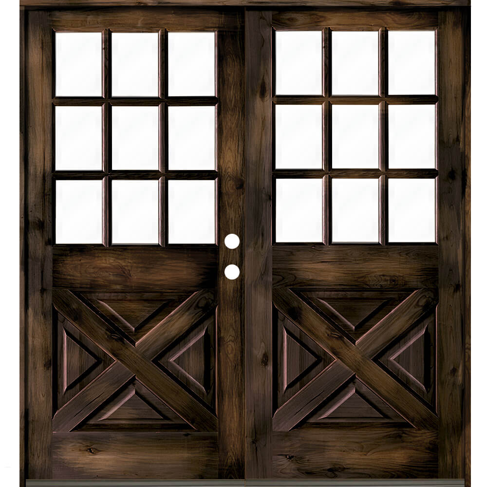 The Farmhouse Knotty Alder 9 Lite Clear Glass X-Panel Exterior Double Door from Krosswood Doors is the perfect eye-catching focal point for your entryway. This rustic door is crafted with superior quality and features natural wood grain, visible knots, X-groove panel, and eighteen clear glass window panes to bring natural light into your home. Find your fit today with our customizable sizes, layouts, and stain options.