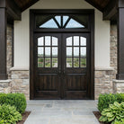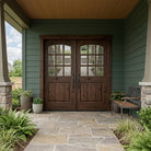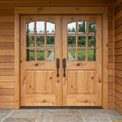 Farmhouse Knotty Alder 9 Lite Glass Arch Top V-Groove Exterior Double Door