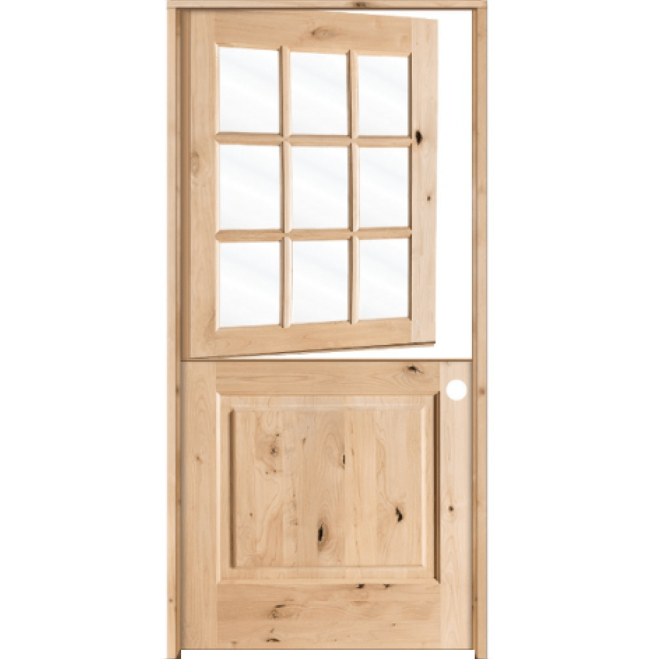The Contemporary Farmhouse Knotty Alder 9 Lite Clear Glass Interior Dutch Door from Krosswood Doors is a unique conversation starter that adds remarkable personality and charm to any home. This versatile wood door features a Dutch door bolt that allows the top leaf to open separately from the bottom – bringing fresh air and a welcoming atmosphere into your home while safely securing pets and children. High-quality craftsmanship, clear glass panels, and textured knotting come together to provide the country-cottage inspiration you’ve been searching for. Find your perfect fit today with our variety of layouts, and stain options.