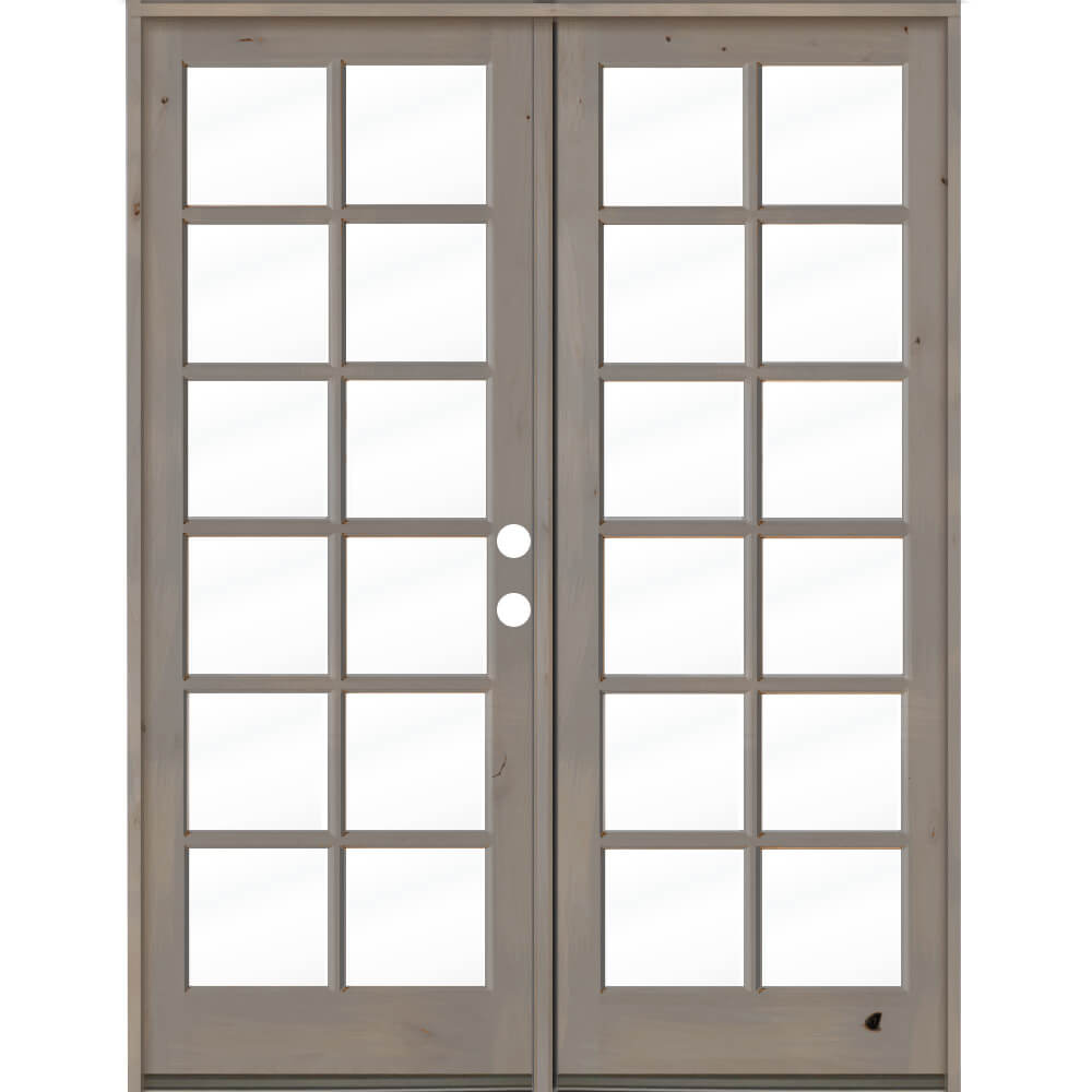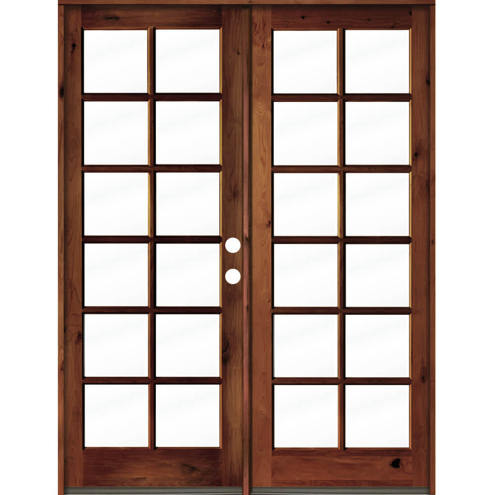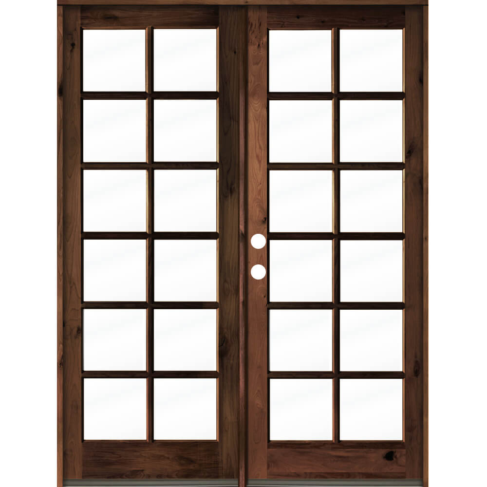 Combine rich, natural wood with glass windows to create a luxurious entryway with the Rustic Knotty Alder 12 Lite Clear Glass Exterior French Double Door from Krosswood Doors. This timeless solid wood French door is made with doweled construction and features unique knotting with twelve clear glass window panels to allow natural light to flow through your home. Start your renovation journey today with our selection of size, layout, and stain options.
