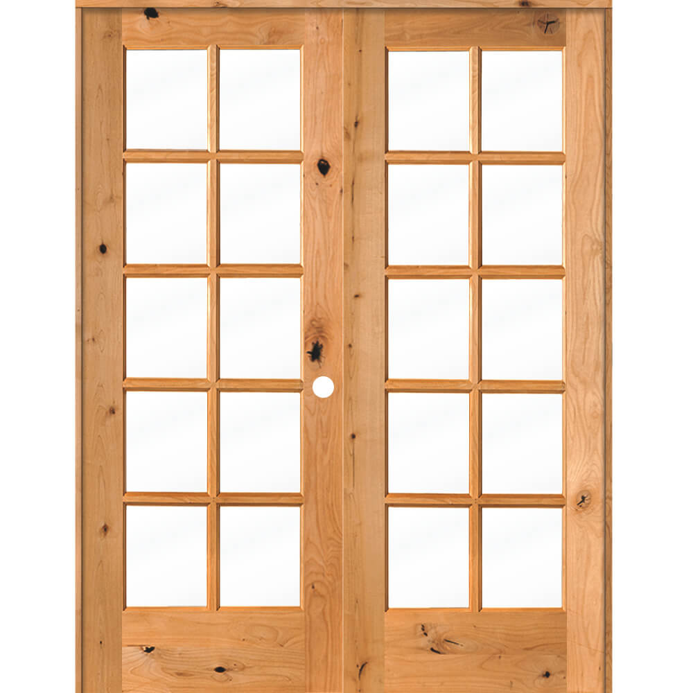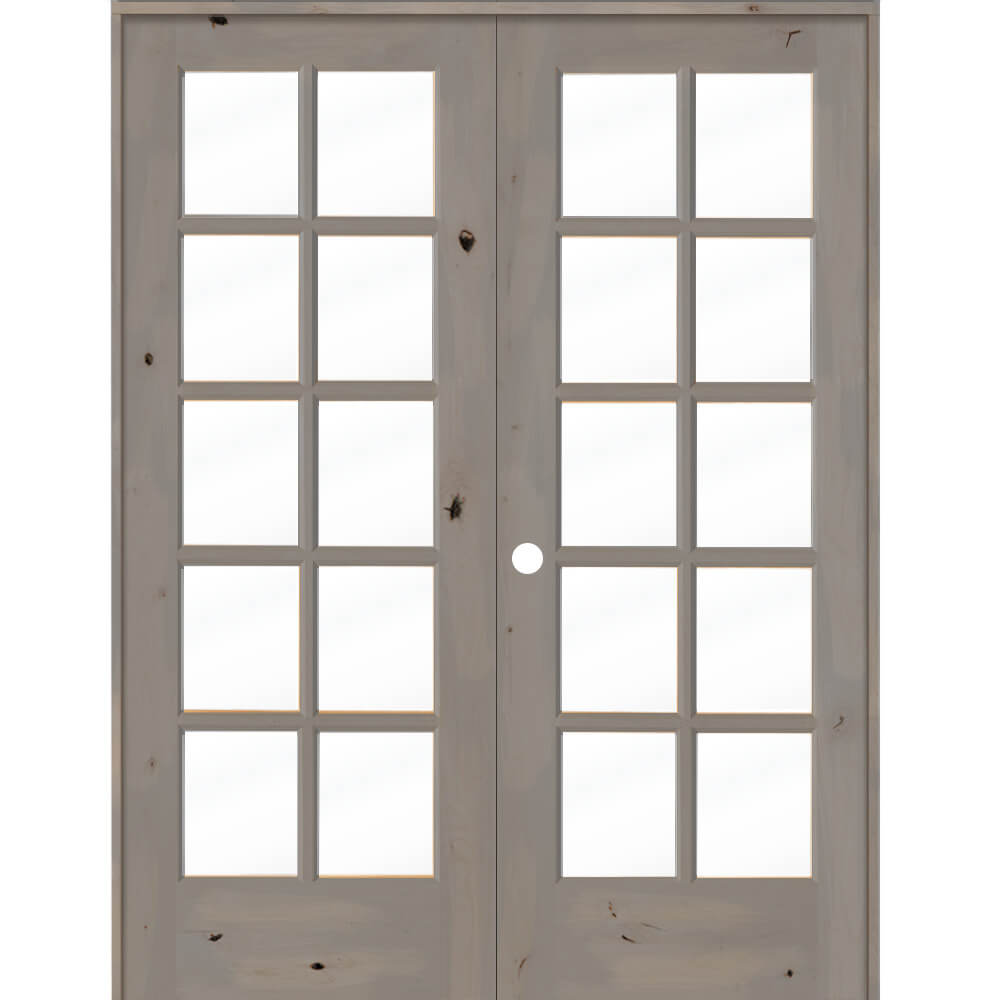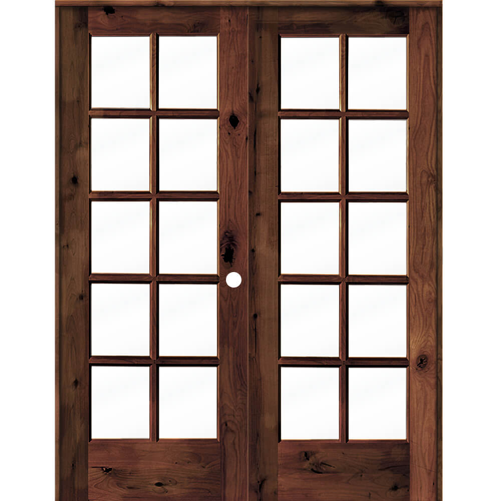 Allow natural light to fill your rooms with the Knotty Alder Wood 10 Lite Clear Glass Window Interior French Double Door from Krosswood Doors. This timeless glass and wood door features unique knotting, natural wood grain, and twenty tempered clear glass window panels to transform your home into a warm, light-filled haven. Customize your perfect French door today with our selection of size, layout, and stain options.