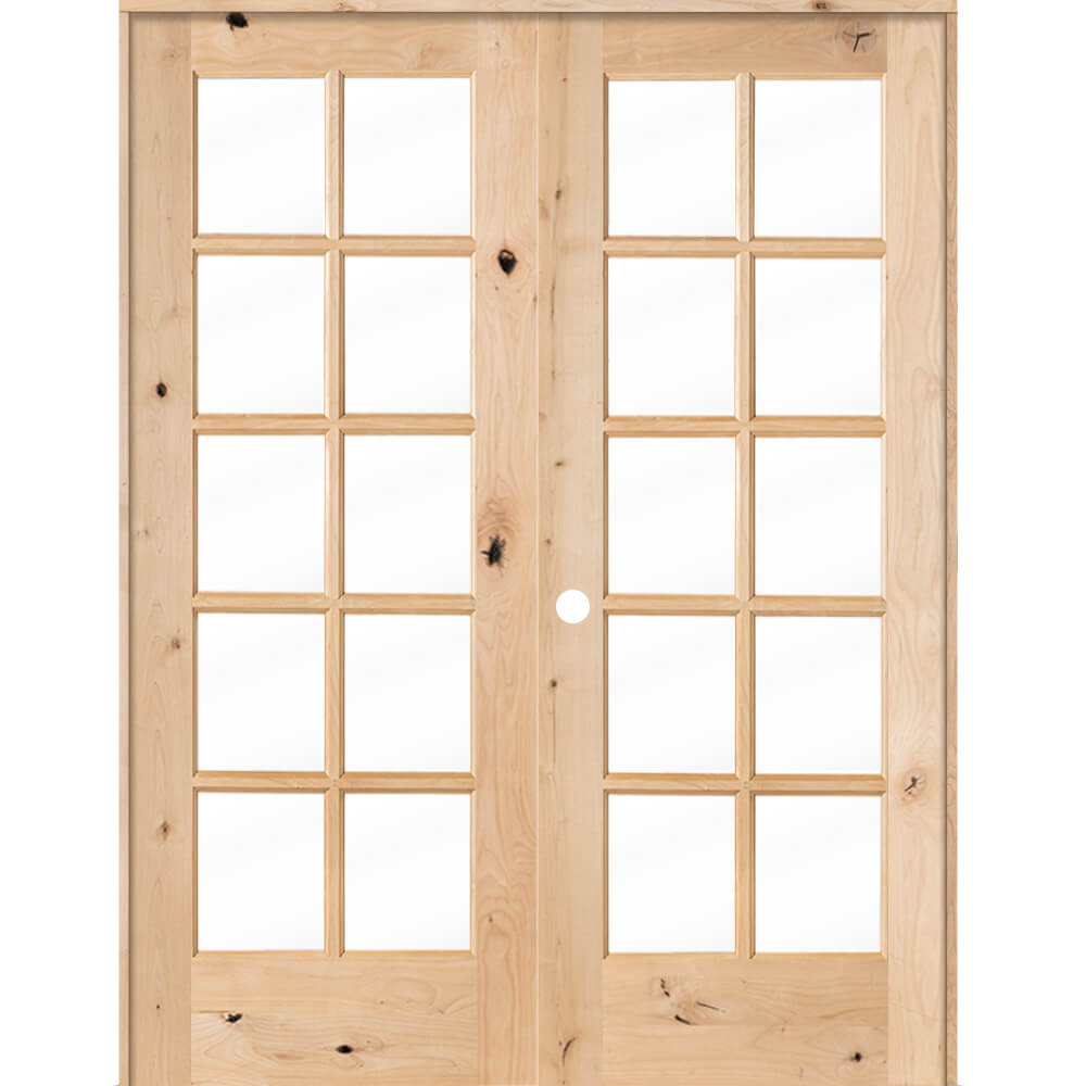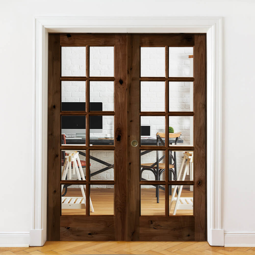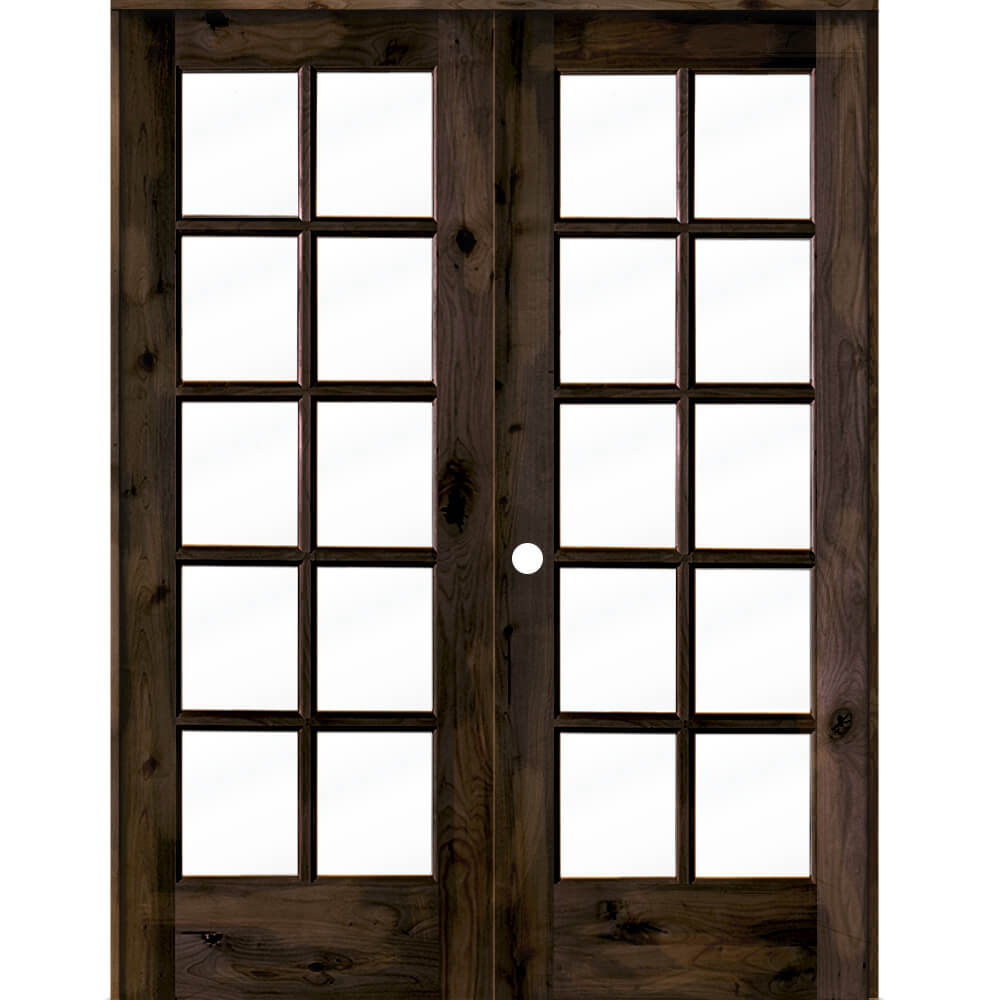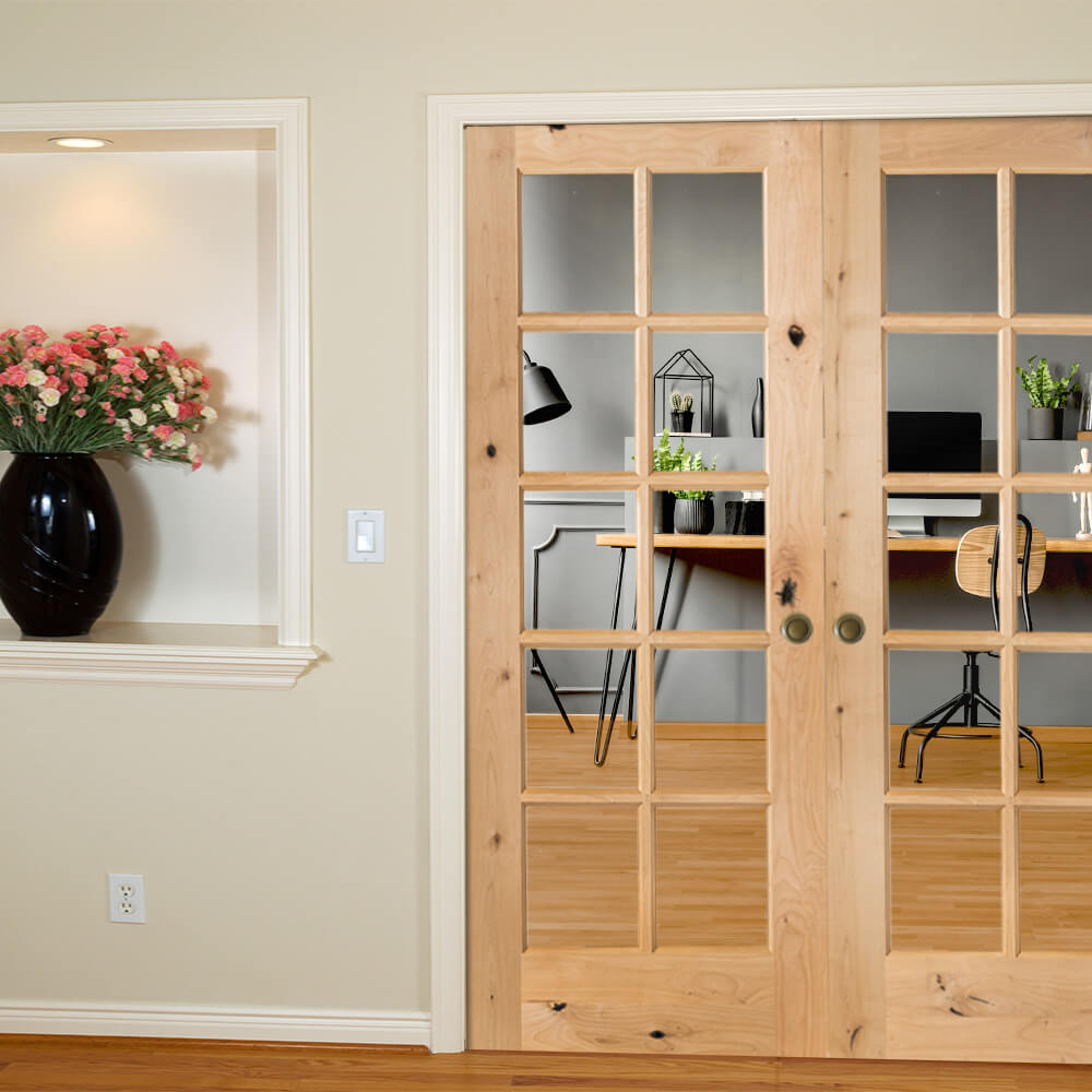 Allow natural light to fill your rooms with the Knotty Alder Wood 10 Lite Clear Glass Window Interior French Double Door from Krosswood Doors. This timeless glass and wood door features unique knotting, natural wood grain, and twenty tempered clear glass window panels to transform your home into a warm, light-filled haven. Customize your perfect French door today with our selection of size, layout, and stain options.