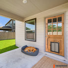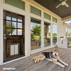 Display superior craftsmanship with the Rustic Knotty Alder Clear Glass 9 Lite Window Exterior Dog Door from Krosswood Doors. This modern farmhouse-inspired door is engineered for strength and longevity and features nine clear glass insulated double pane windows, unique textured knotting, and a large energy-efficient PlexiDor pet door to give you and your pet the flexibility you need. Customize your perfect door today with our selection of sizes and stain options - professionally hand-stained and shipped from our two United States locations.