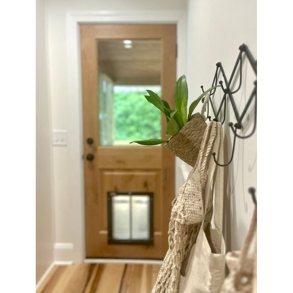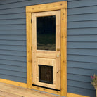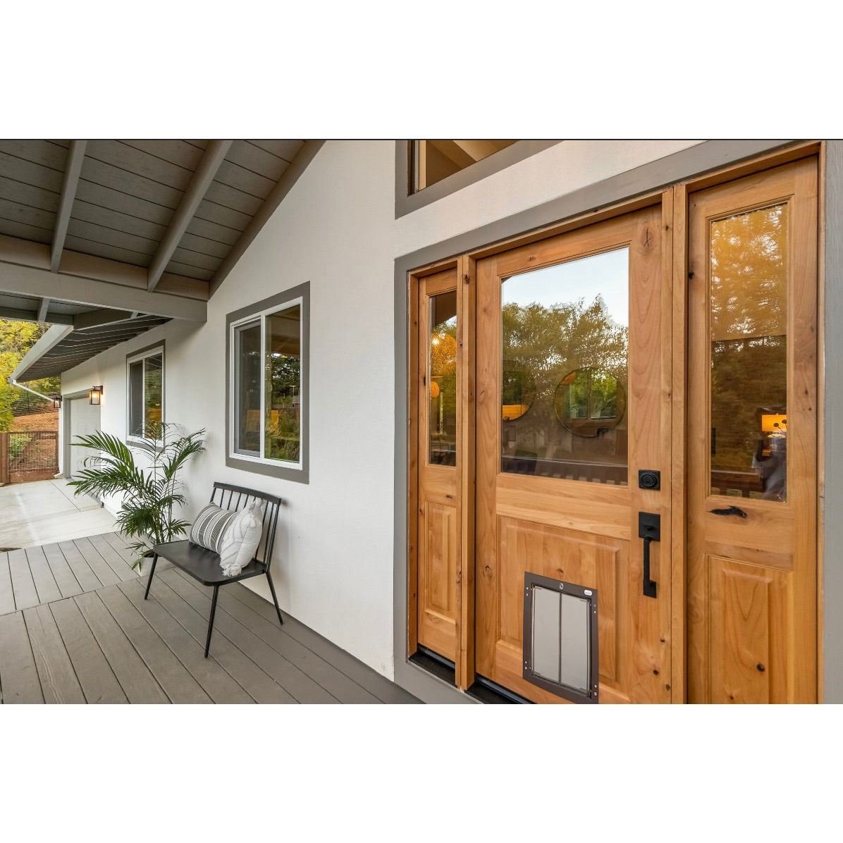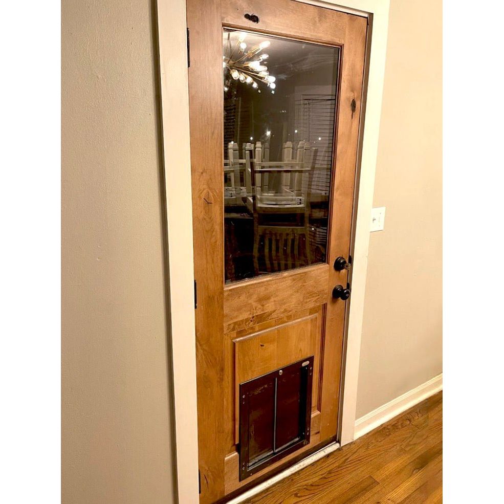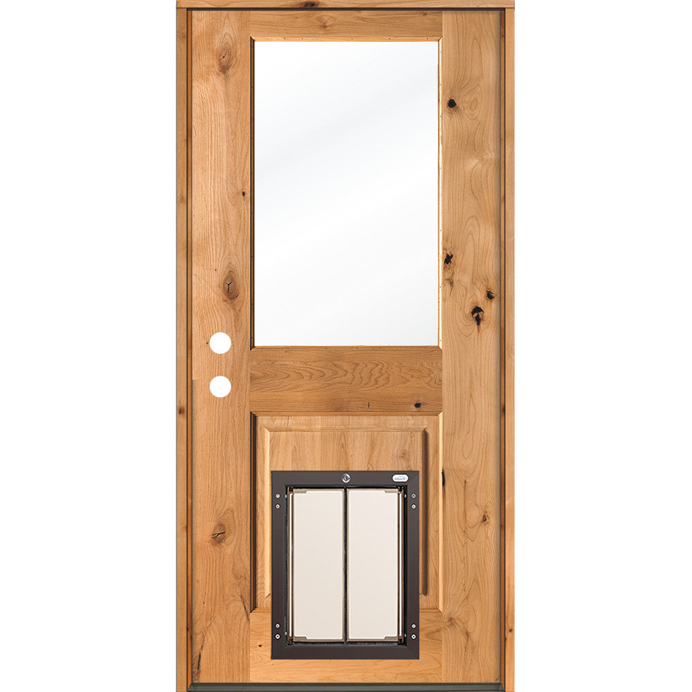Create a bright and functional entryway for you and your dog with the Modern Farmhouse Knotty Alder Half Lite Clear Glass Front Door from Krosswood Doors. This Modern Farmhouse-inspired solid wood door is engineered for strength and longevity and features a clear glass window and energy-efficient PlexiDor pet door, which allows freedom for your furry friend without sacrificing safety. Customize the perfect door for your home with our various size and stain options.