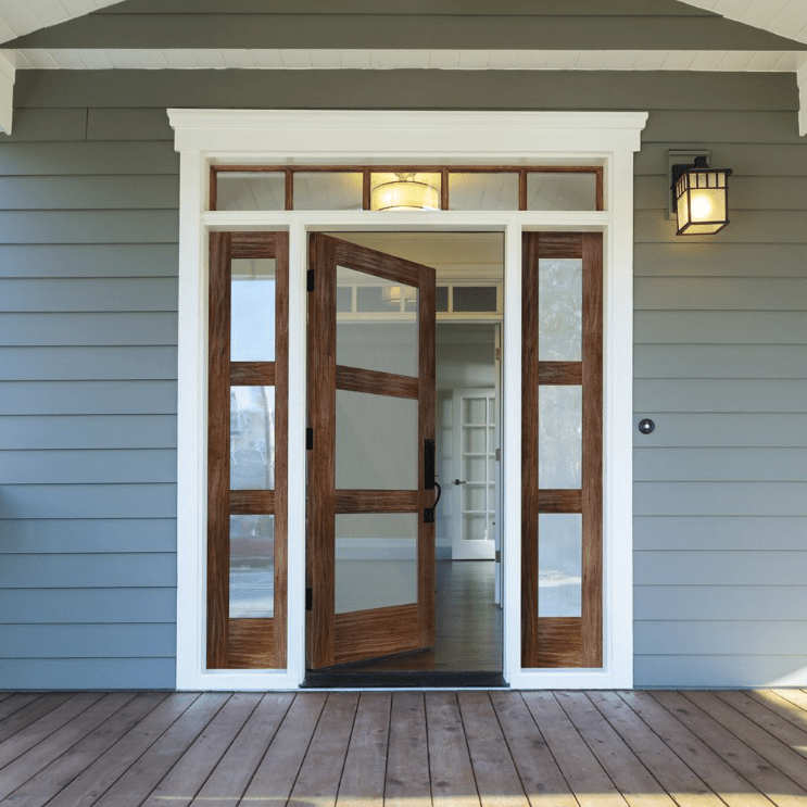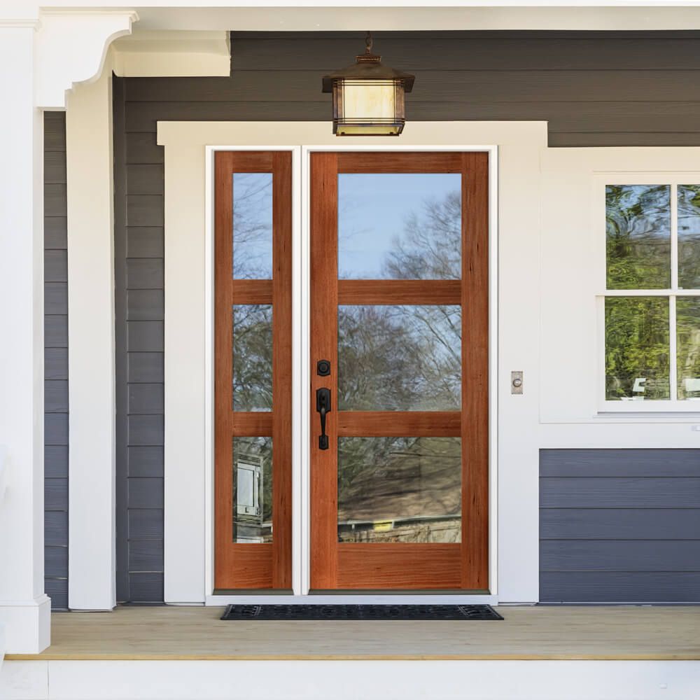 The Modern Hemlock 3 Lite Clear Glass Exterior Door from Krosswood Doors embraces clean, minimalistic design without sacrificing the warmth and feel of natural wood. Every door we craft is engineered for strength and longevity and feature three clear glass panels to allow light into your entryway. Hemlock wood provides a straight wood grain which is ideal for painting or staining, and the stable doweled construction ensures each door stands the test of time. Discover your perfect door today with our customizable sizes, layouts, and stain options.