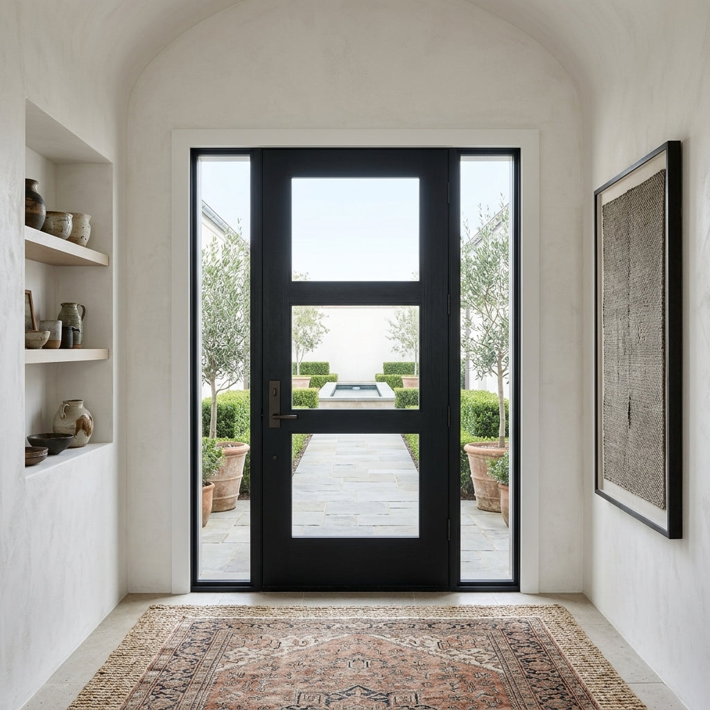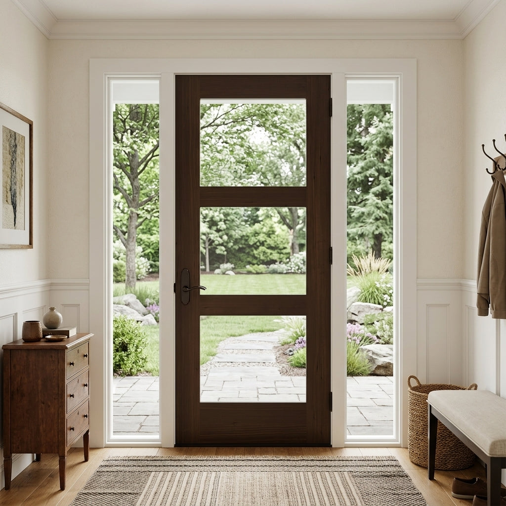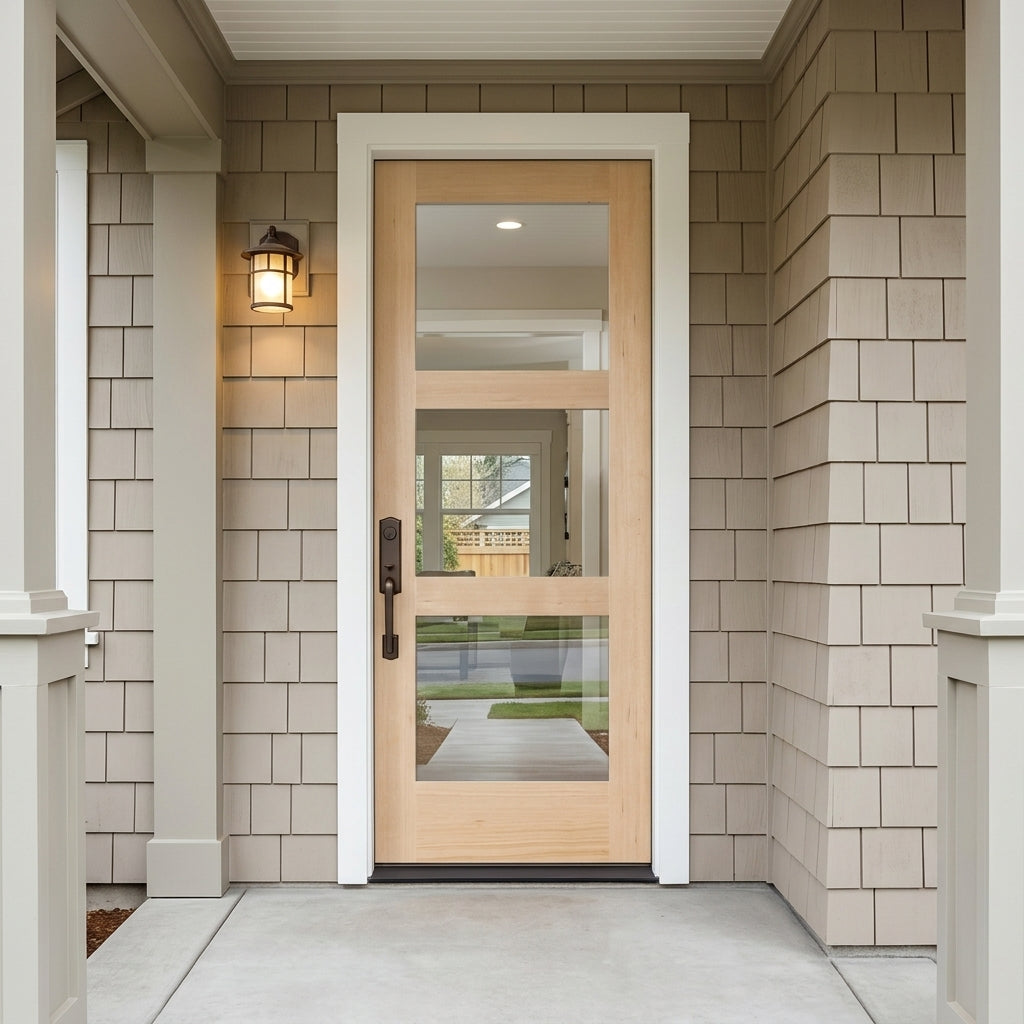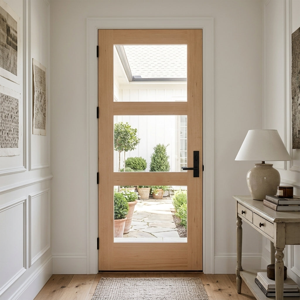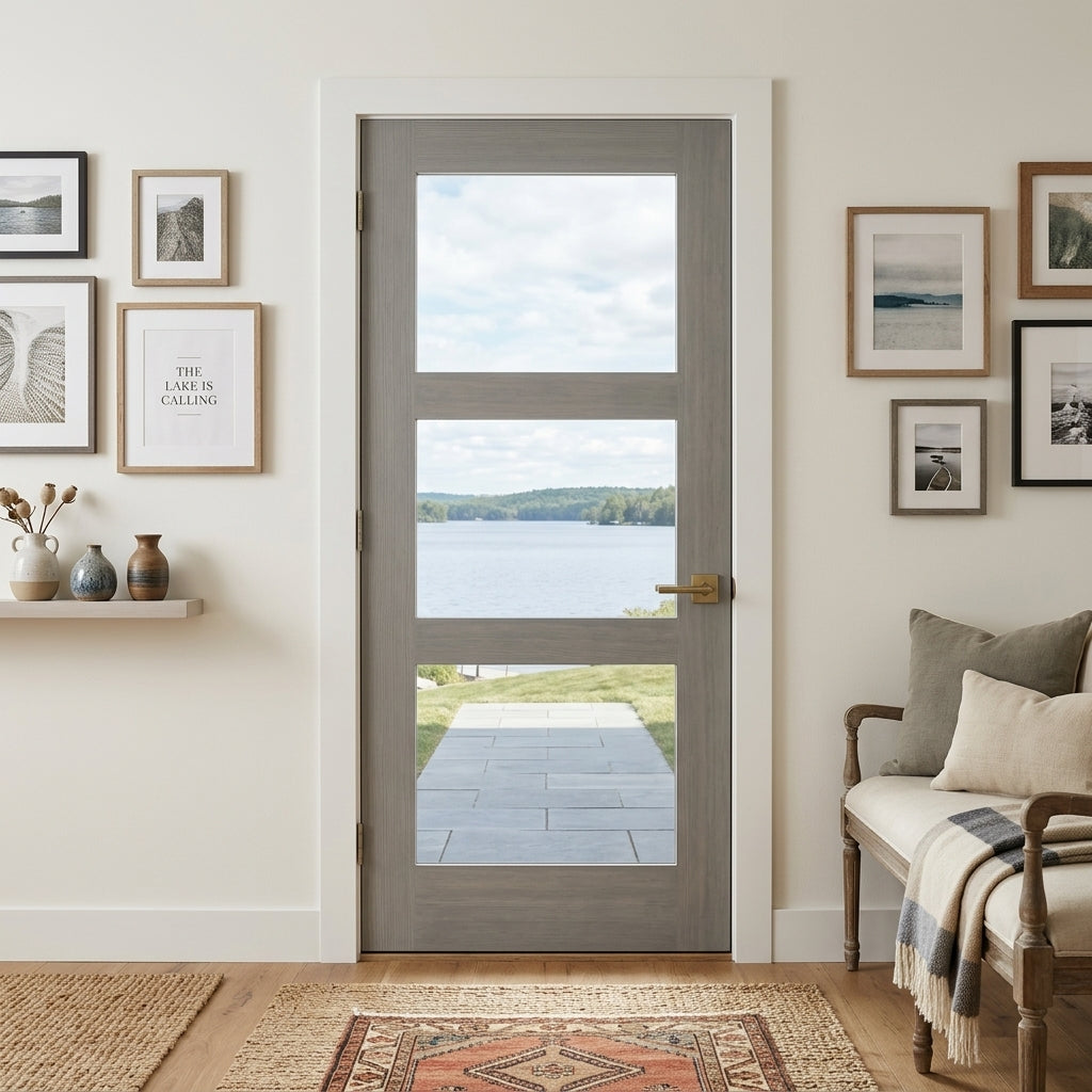 The Modern Hemlock 3 Lite Clear Glass Exterior Door from Krosswood Doors embraces clean, minimalistic design without sacrificing the warmth and feel of natural wood. Every door we craft is engineered for strength and longevity and feature three clear glass panels to allow light into your entryway. Hemlock wood provides a straight wood grain which is ideal for painting or staining, and the stable doweled construction ensures each door stands the test of time. Discover your perfect door today with our customizable sizes, layouts, and stain options.