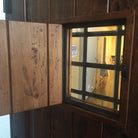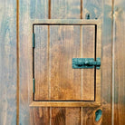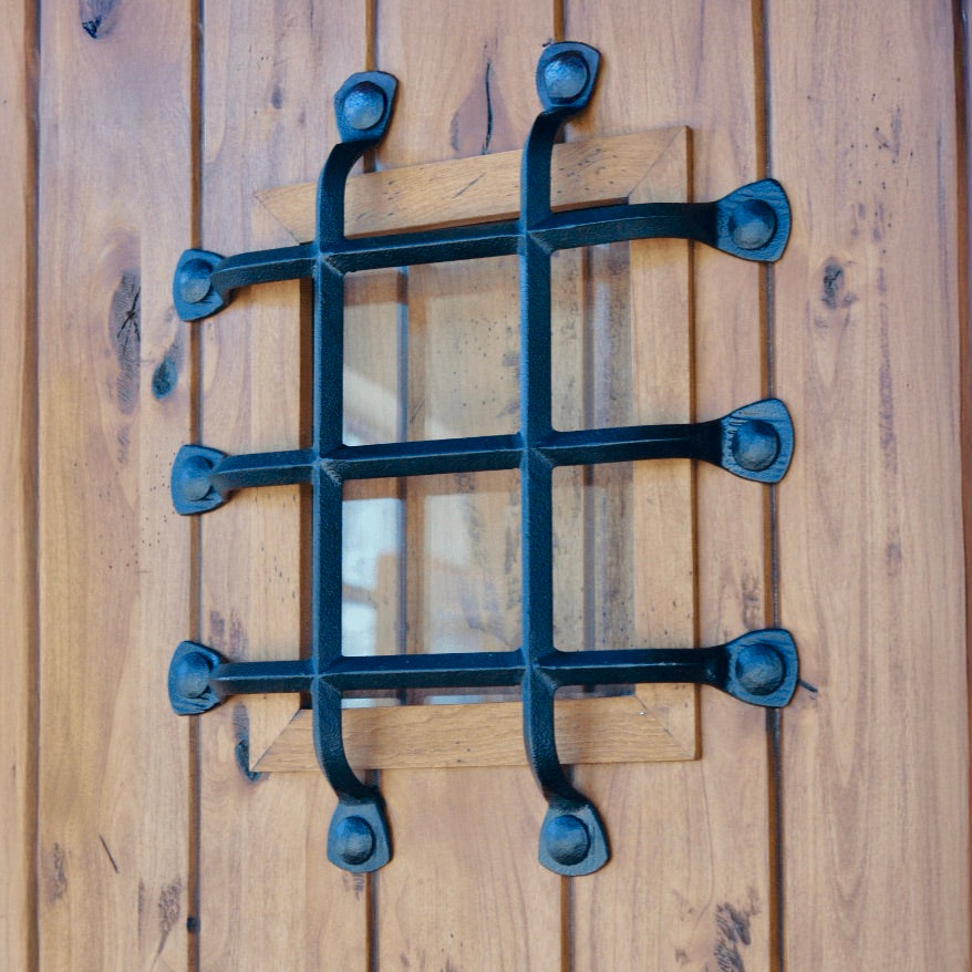Functional speakeasy window features clear glass, a wooden latch with iron bolt, and wrought iron grille