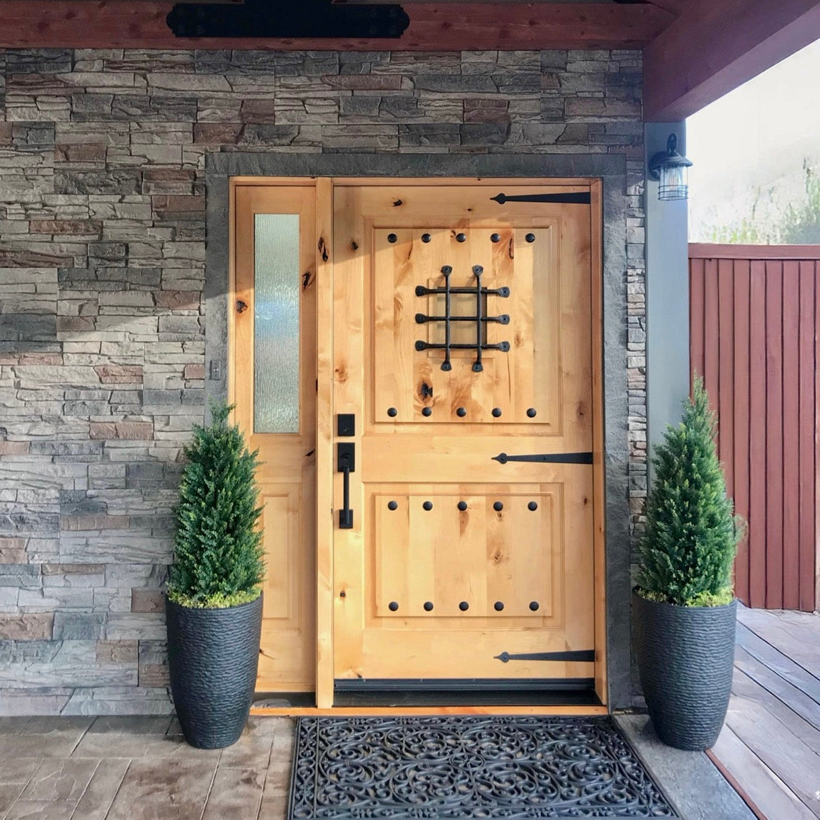 Reminiscent of sun-soaked European architecture, the Mediterranean Knotty Alder Square Top V-Groove Front Door from Krosswood Doors features luxurious wood grain, textured knotting, decorative iron details, and a unique speak-easy window with functioning latch. Our doors are crafted with superior doweled construction and hand-finished in the United States to ensure that each one is a true work of art. Customize your perfect Spanish-style door today with our selection of size, layout, and stain options.