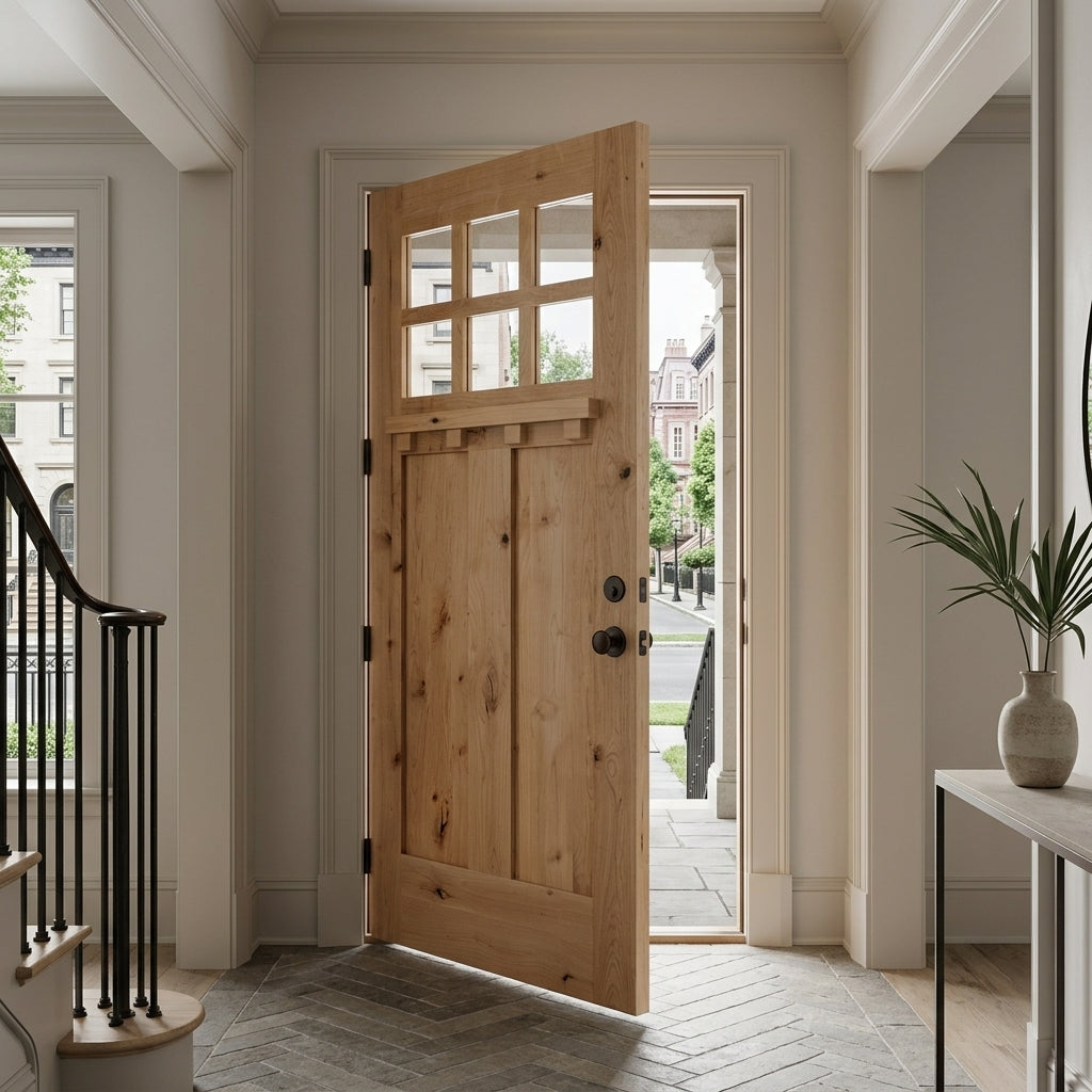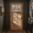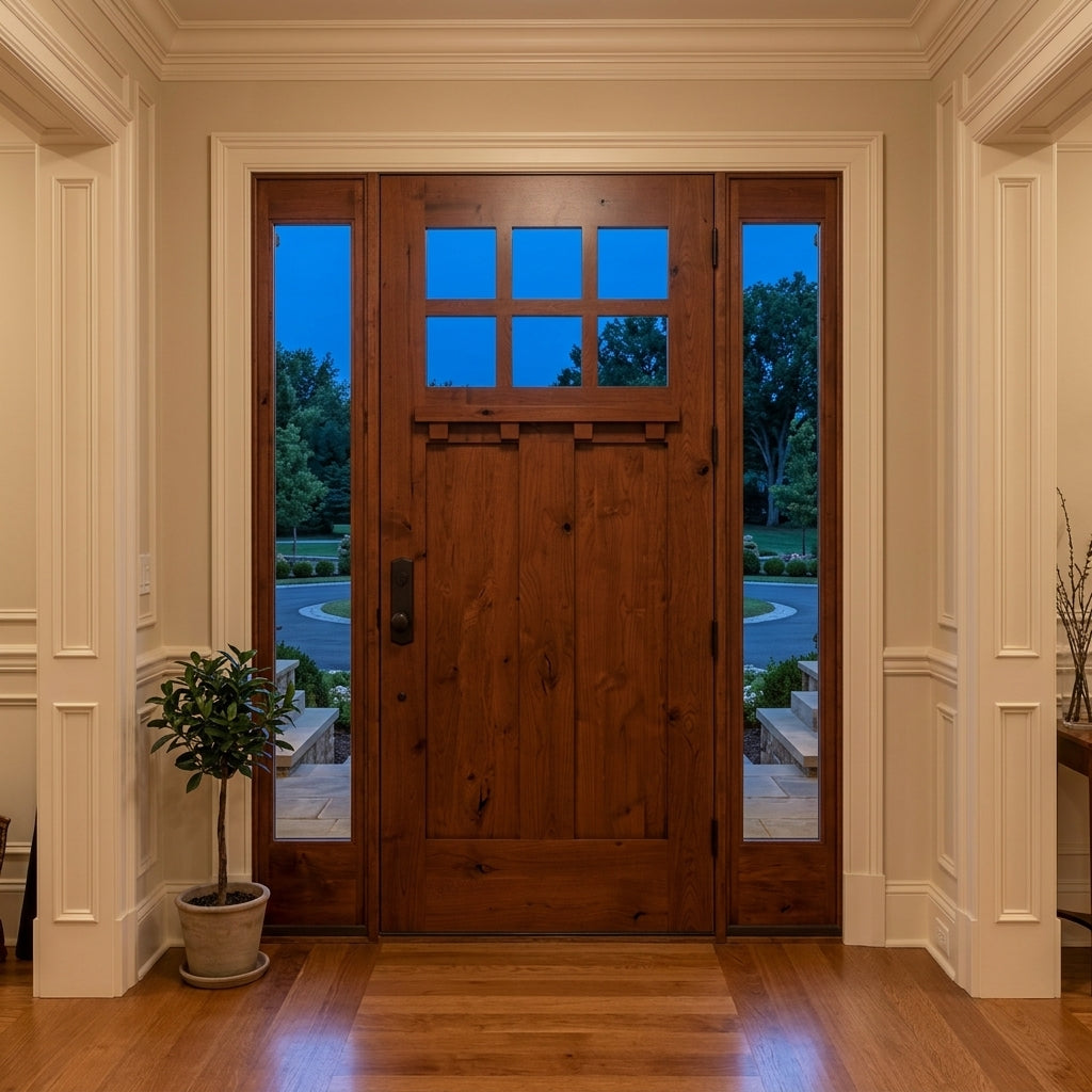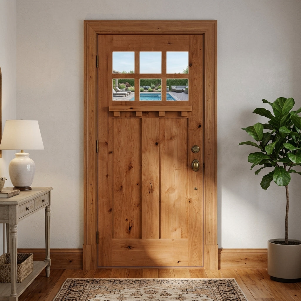 A high value home deserves a high value entryway, and the American Craftsman Knotty Alder 6 Lite Clear Glass Window Front Door from Krosswood Doors embraces handcrafted design and superior quality construction. Every solid wood door is engineered for strength and longevity, and features natural wood grain, unique knotting, a decorative dentil shelf, and six clear beveled glass panels to allow natural light into your home. Find your perfect fit today with our customizable size, layout, and stain options.
