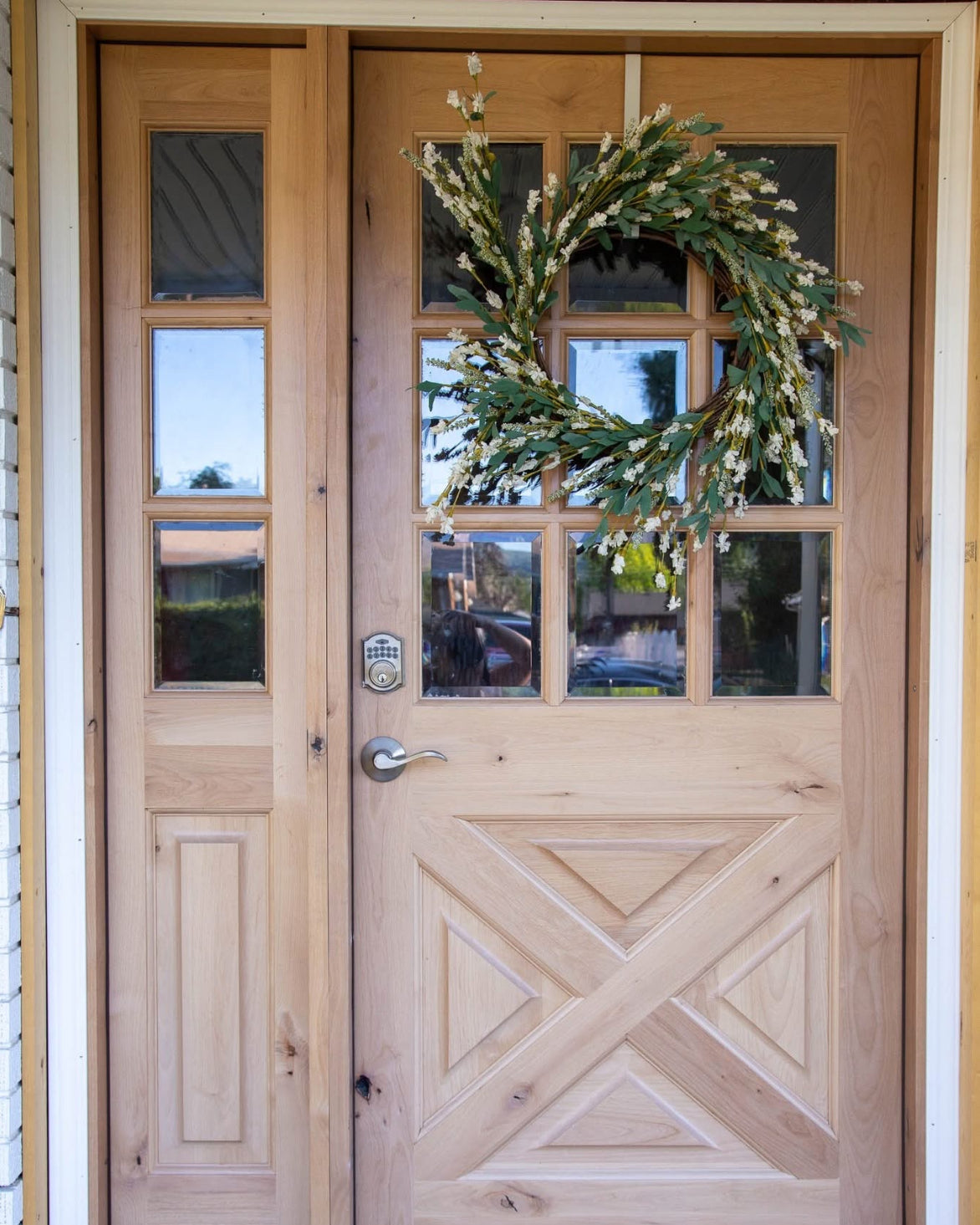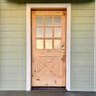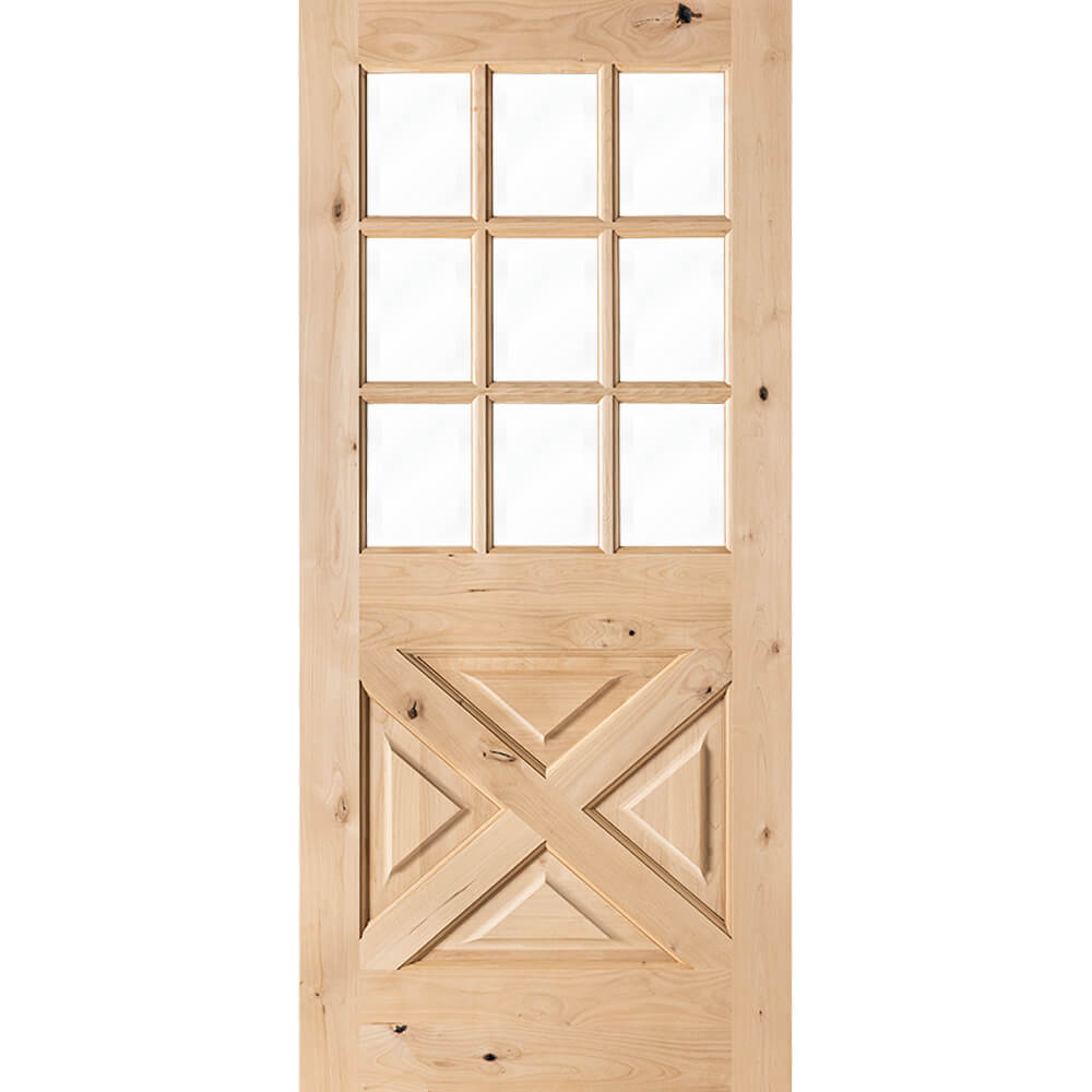 The Knotty Alder 9 Lite Clear Glass X-Panel Front Door from Krosswood Doors is the perfect eye-catching focal point for your entryway. This rustic Farmhouse inspired door is crafted with superior quality and features natural wood grain, visible knots, one X-groove panel, and nine clear beveled glass windowpanes to bring natural light into your home. Find your fit today with our customizable sizes, layouts, and stain options.