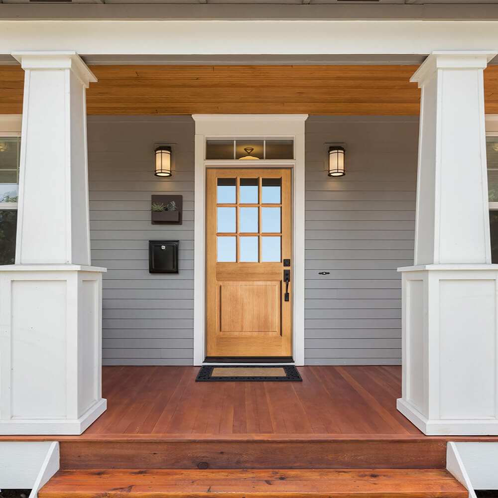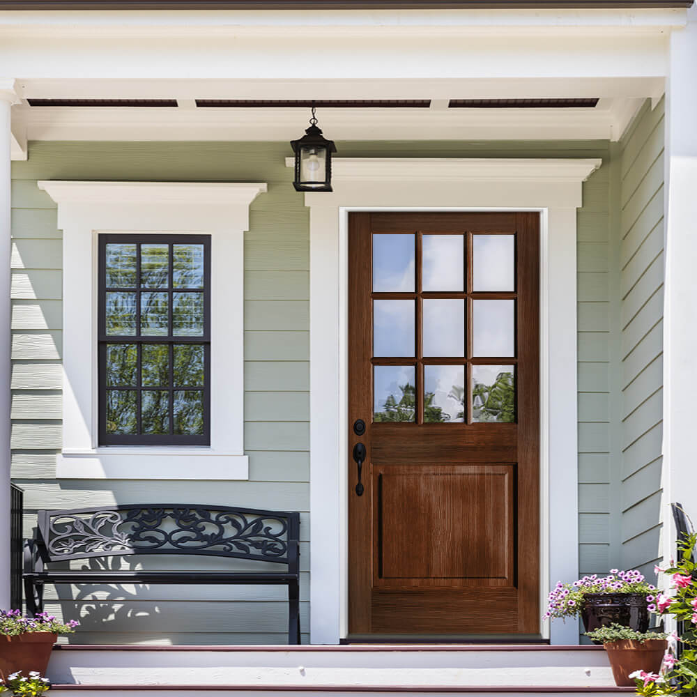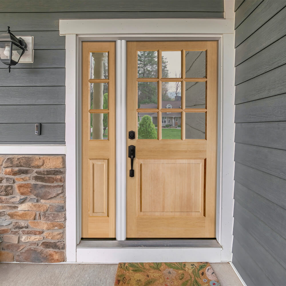 The Modern Farmhouse Douglas Fir Wood 9 Lite Clear Glass Front Door by Krosswood Doors provides superior craftsmanship and timeless appeal for your home. This eye-catching solid wood door features straight, rot-resistant wood grain which is perfect for painting or staining, and nine clear glass beveled window panes that allow natural light to brighten your entryway. Transform your home today with our wide selection of size, layout, and stain options.