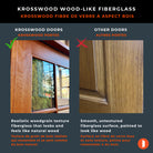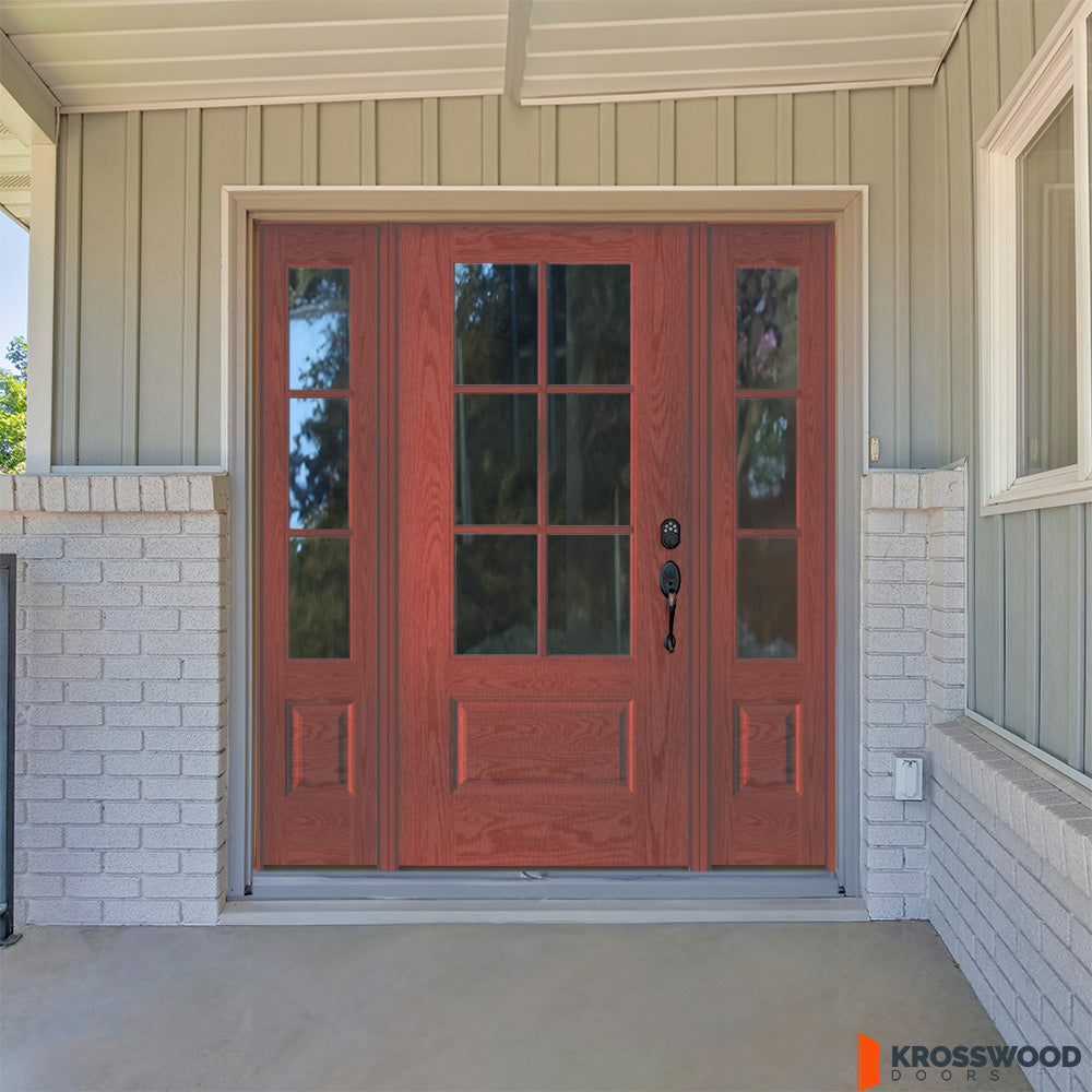 The UINTAH Modern Farmhouse 6 Lite Clear Glass Window Wood-Like Fiberglass Front Door from Krosswood Doors will transform your exterior into an eye-catching statement piece that will stand the test of time. Our fiberglass doors are engineered to last for decades, and feature a stainable mahogany wood-like textured surface with a high-density insulating core. Six insulated double pane clear glass windows let in plenty of natural light to brighten your entryway. Find the perfect door for you with our six stain options – expertly applied in the United States – as well as glass, layout, and sidelight options.