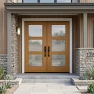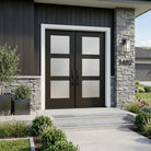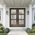 Presenting our contemporary masterpiece: the BRIGHTON Modern Fiberglass 3 Lite Frosted Glass Front Double Door from Krosswood Doors, with a mahogany wood textured surface that feels like real wood without the maintenance. Designed to complement a variety of architectural styles, this modern fiberglass exterior door stands as a testament to both design and function with six satin glass privacy windows, insulating core, and mahogany wood like textured finish, ready to be painted or stained in a variety of colors. Find the perfect double door for you with our versatile stain options – expertly applied in the United States – as well as glass, layout, and sidelight options.