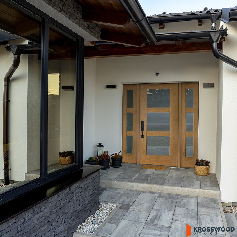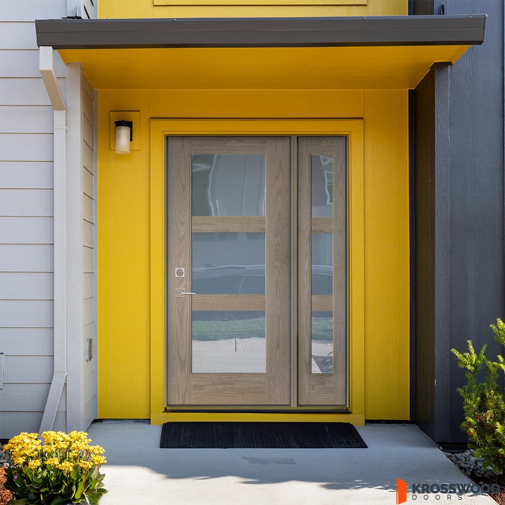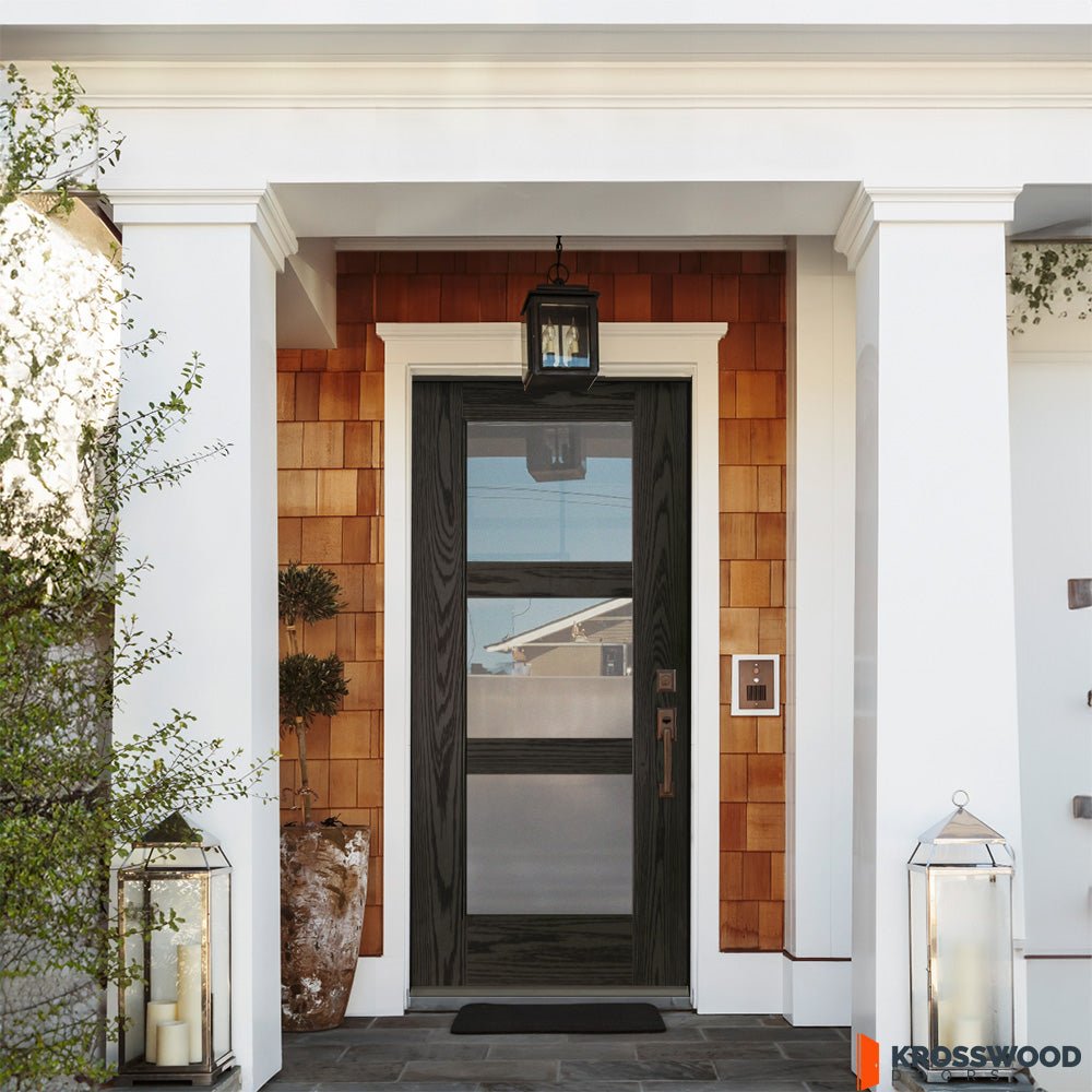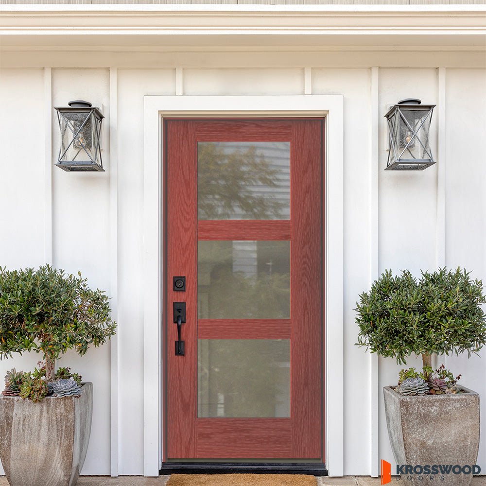 Presenting our contemporary masterpiece: the BRIGHTON Modern Fiberglass 3 Lite Frosted Glass Wood-Like Exterior Front Door from Krosswood Doors, with a mahogany wood textured surface that looks like real wood without the maintenance. Designed to complement a variety of architectural styles, this modern fiberglass exterior door stands as a testament to both design and function with three privacy satin etched glass windows, an insulating core, and mahogany wood like textured finish, ready to be painted or stained in a variety of colors. Find the perfect front door for you with our versatile stain options – expertly applied in the United States – as well as glass, layout, and sidelight options.