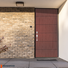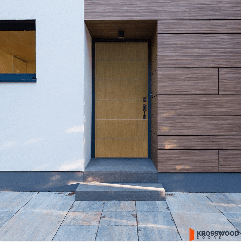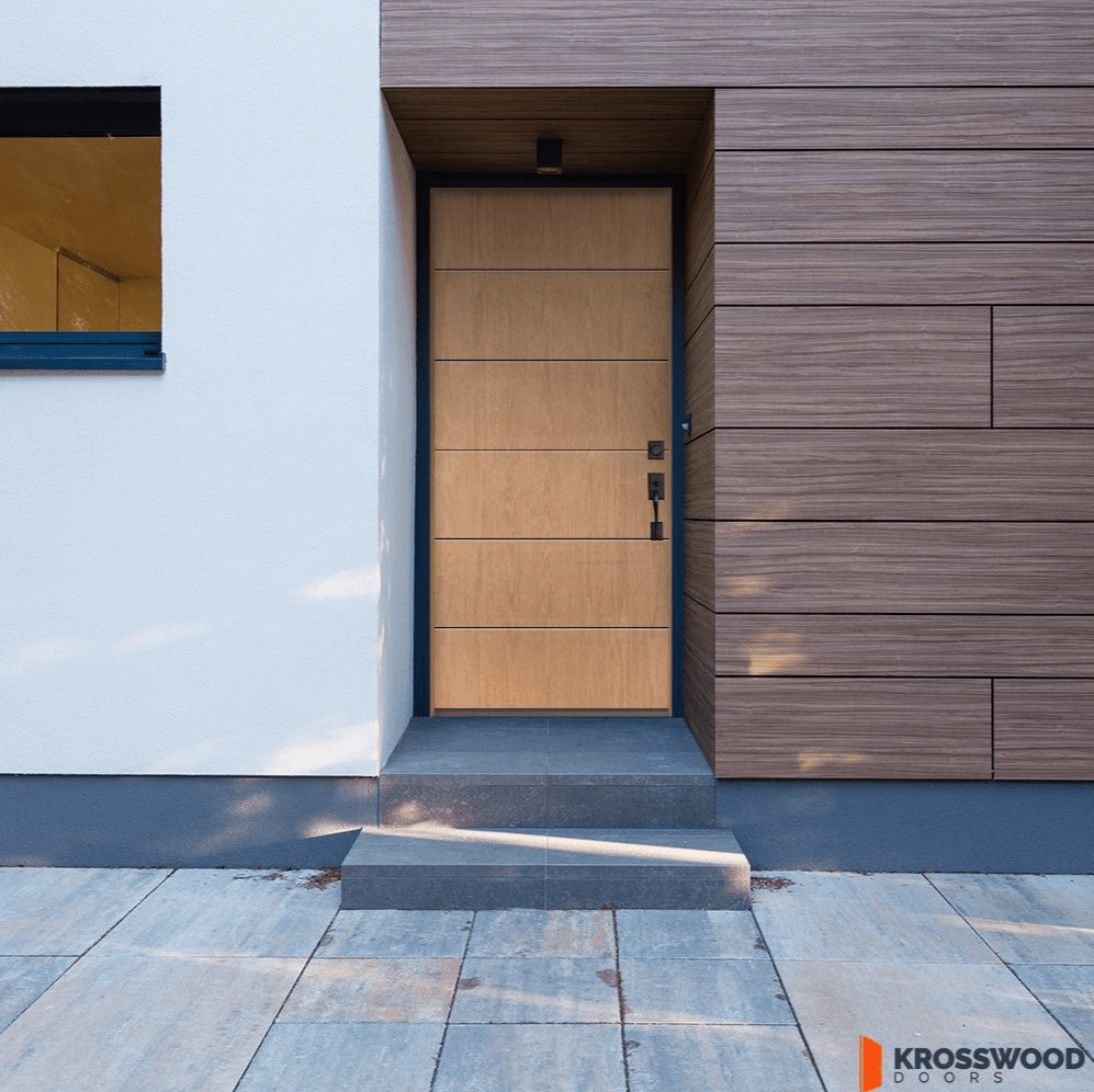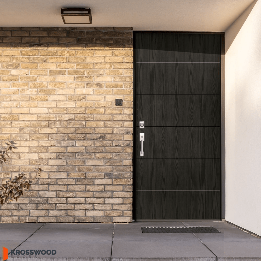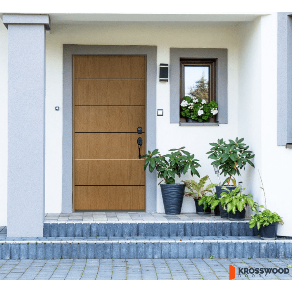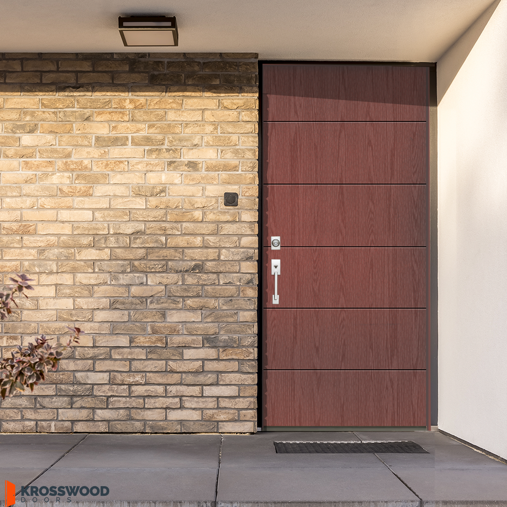 Engineered for strength and longevity, the TETON Modern Fiberglass Grooved Flat Panel Front Door from Krosswood Doors seamlessly combines the durability of fiberglass with the rich allure of a mahogany wood-like textured surface. A high-density insulating core and horizontal grooved panel design offers the long-lasting comfort you need to create a stunning exterior for any modern, contemporary, or traditional home. Customize your perfect exterior door today with one of our six wood stain options – expertly applied in the United States at the time of purchase – or order unfinished, ready to paint or stain in your color preference.