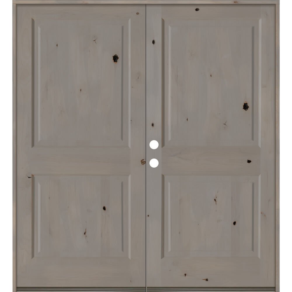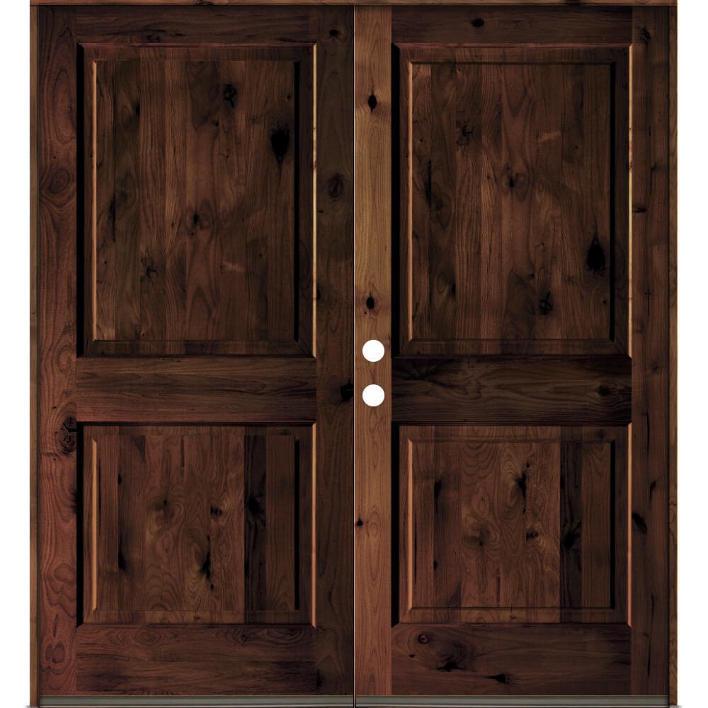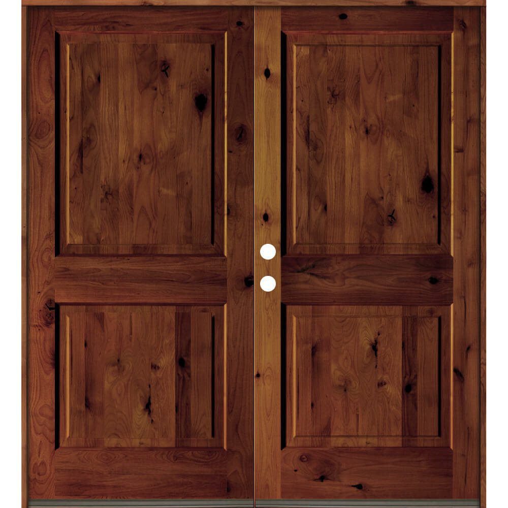 The Rustic Farmhouse Knotty Alder 2-Panel Square Top Front Double Door from Krosswood Doors blends raw elegance with superior craftsmanship. Every door is engineered for strength and longevity and features natural wood grain with unique, textured knotting. Hand-finished in the United States, we ensure that each piece is a work of art. Discover your perfect front door today with our customizable sizes, layouts, and stain options.