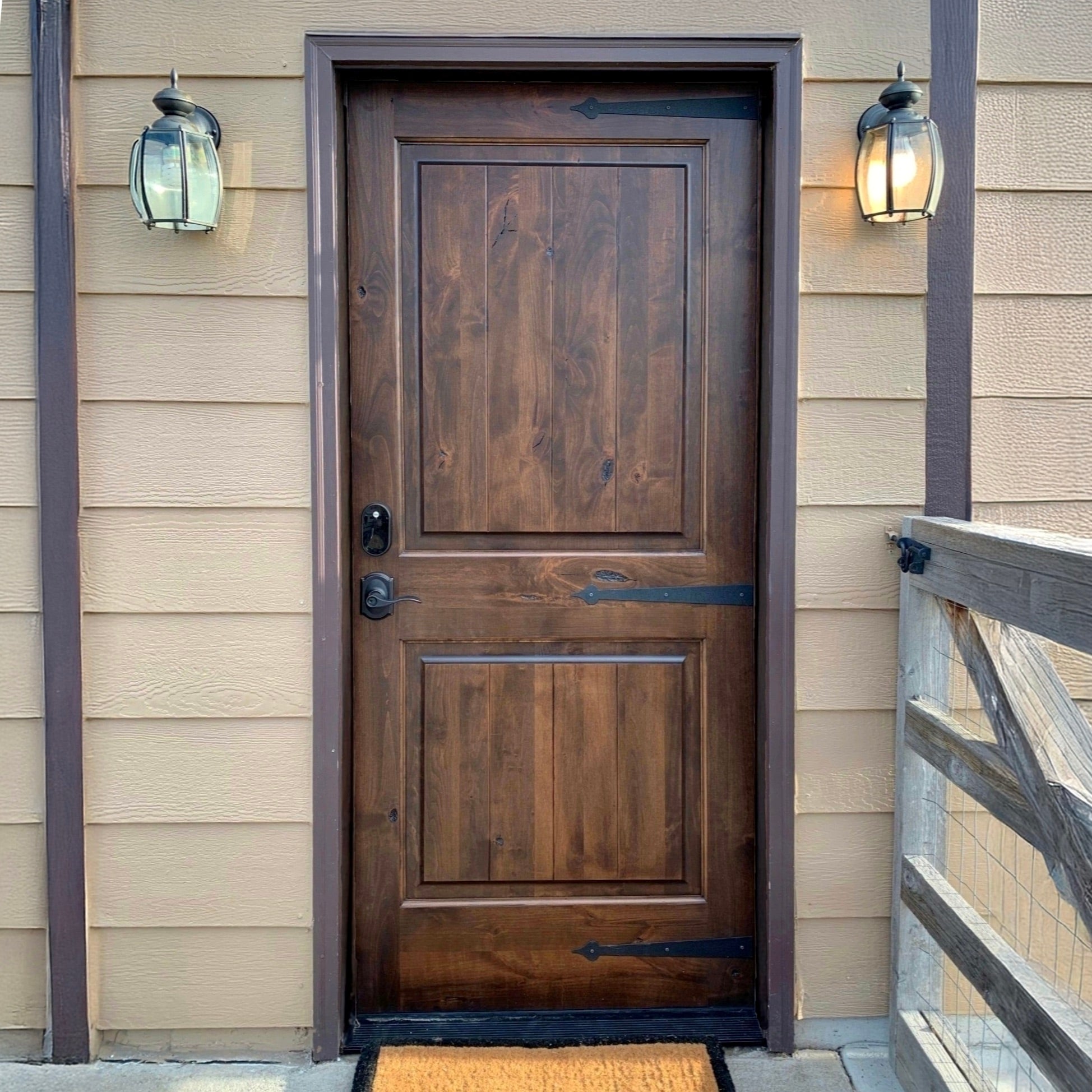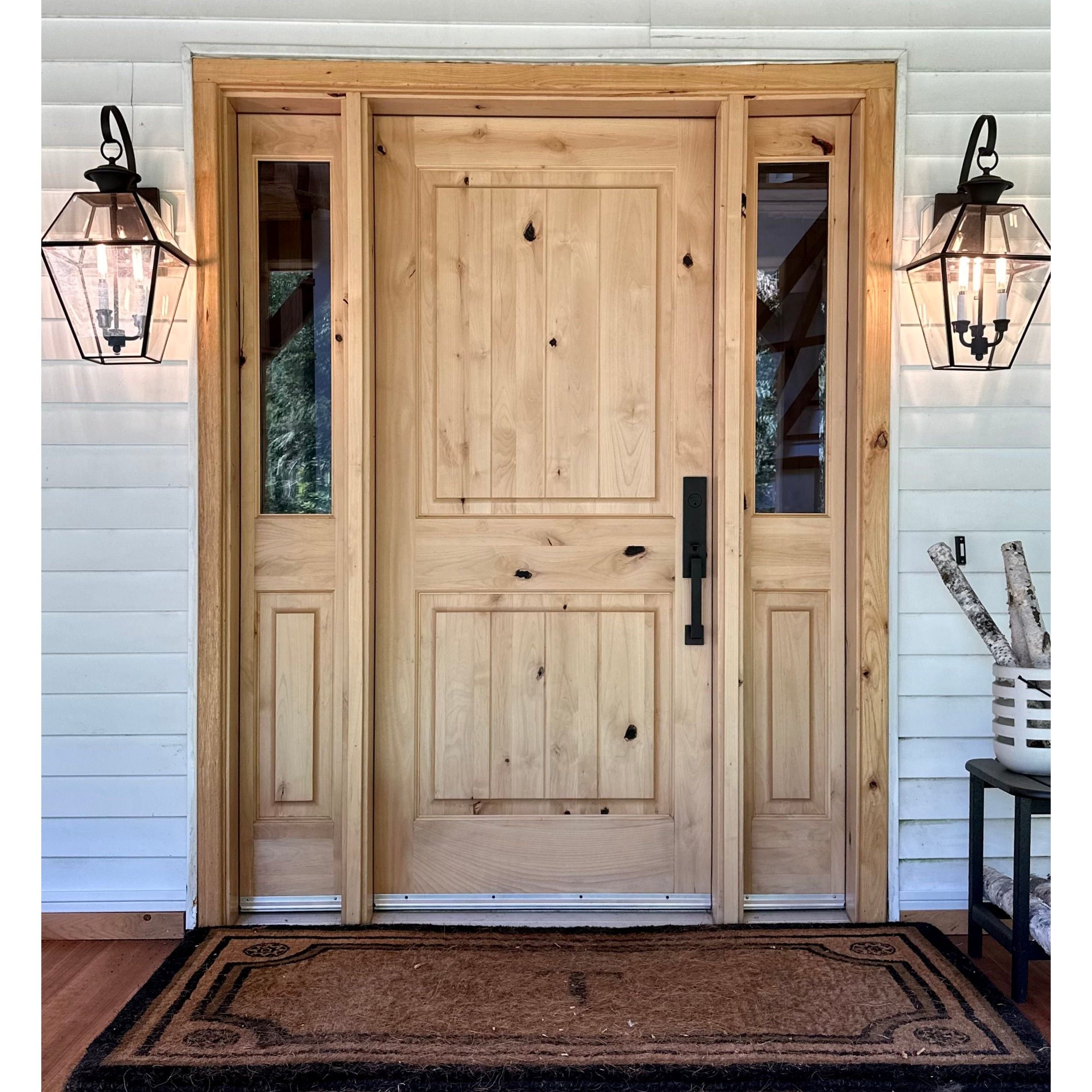 The Rustic Knotty Alder Square-Top V-Groove Wood Front Door from Krosswood Doors calls to mind simpler times when homes were built for function and longevity while displaying the natural beauty of exposed wood. This eye-catching wood door is the perfect example of the Farmhouse style with its hand-finished V-groove panels, stunning hardwood grain, unique knotting, and sturdy, doweled joint construction to ensure that your door will be a favorite for generations to come. Customize the perfect door for you with our selection of size, layout, and stain options.