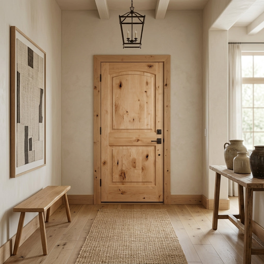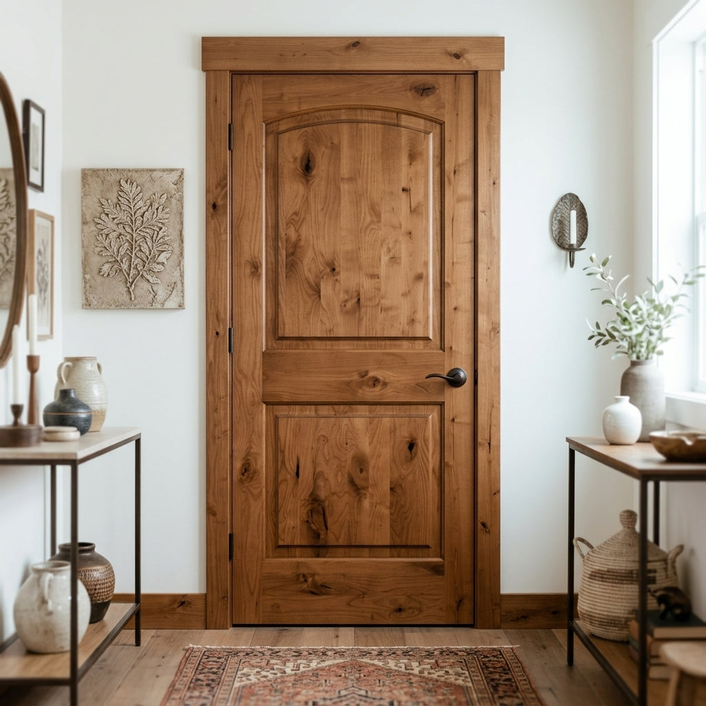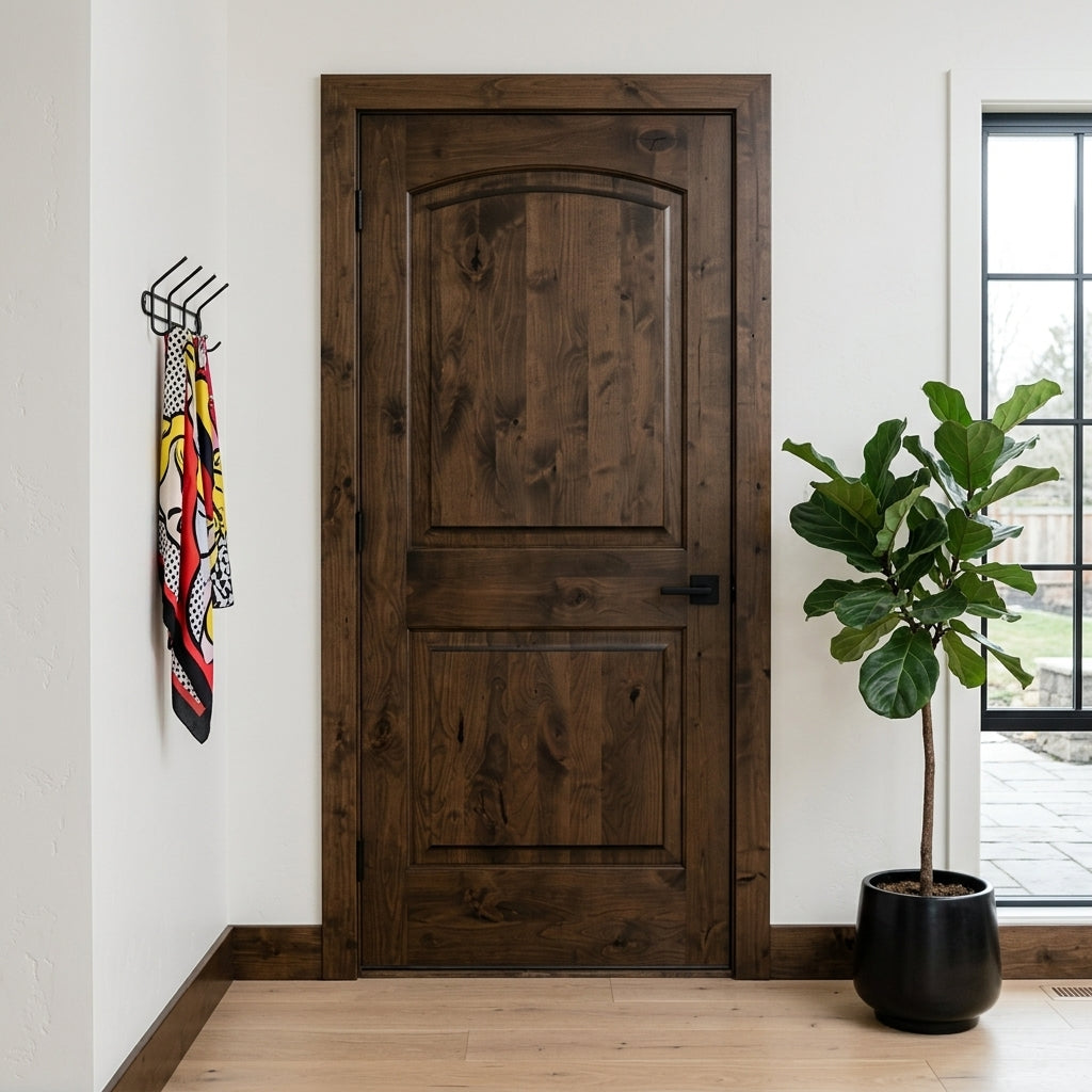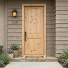 The Rustic Arch Top Knotty Alder Wood Front Door from Krosswood Doors is crafted with superior quality and the timeless character of natural wood. The combination of gorgeous warm tones, unique knotting, and natural wood grain give this door a rich aesthetic that will complement your home for years to come. Find your perfect fit today with customizable layouts, sizes, and stain options.